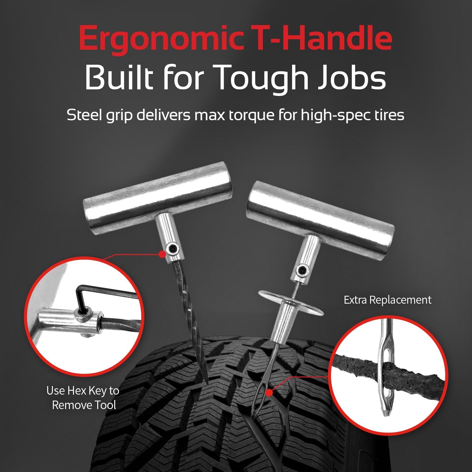 - [🧰Effortless Repairs with Convenient and Ergonomic Tools] Our tire repair tool kit features ergonomically designed tools with easy-grip T-handles that provide a nonslip experience. The result? An effortless tire repair process that gets you back on the road in record time. No experience? No problem! We have included a comprehensive instructions manual to guide you every step of the way.
