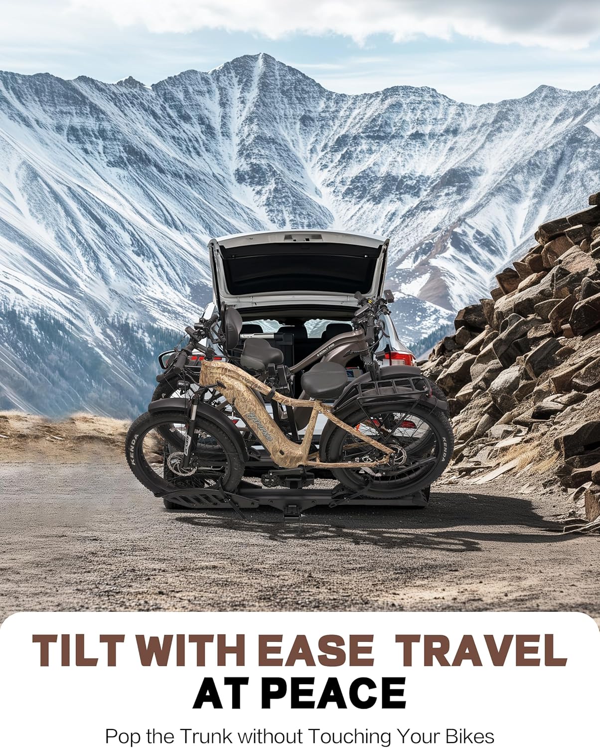 - SAFE AND SECURE ON OFFROAD: Comes with 2-arm fix, Anti-falloff 360° swirl structure, patent secure wheel cradles and anti-wobble structure, that secure your E-bikes in place without swaying and knocking against vehicle.