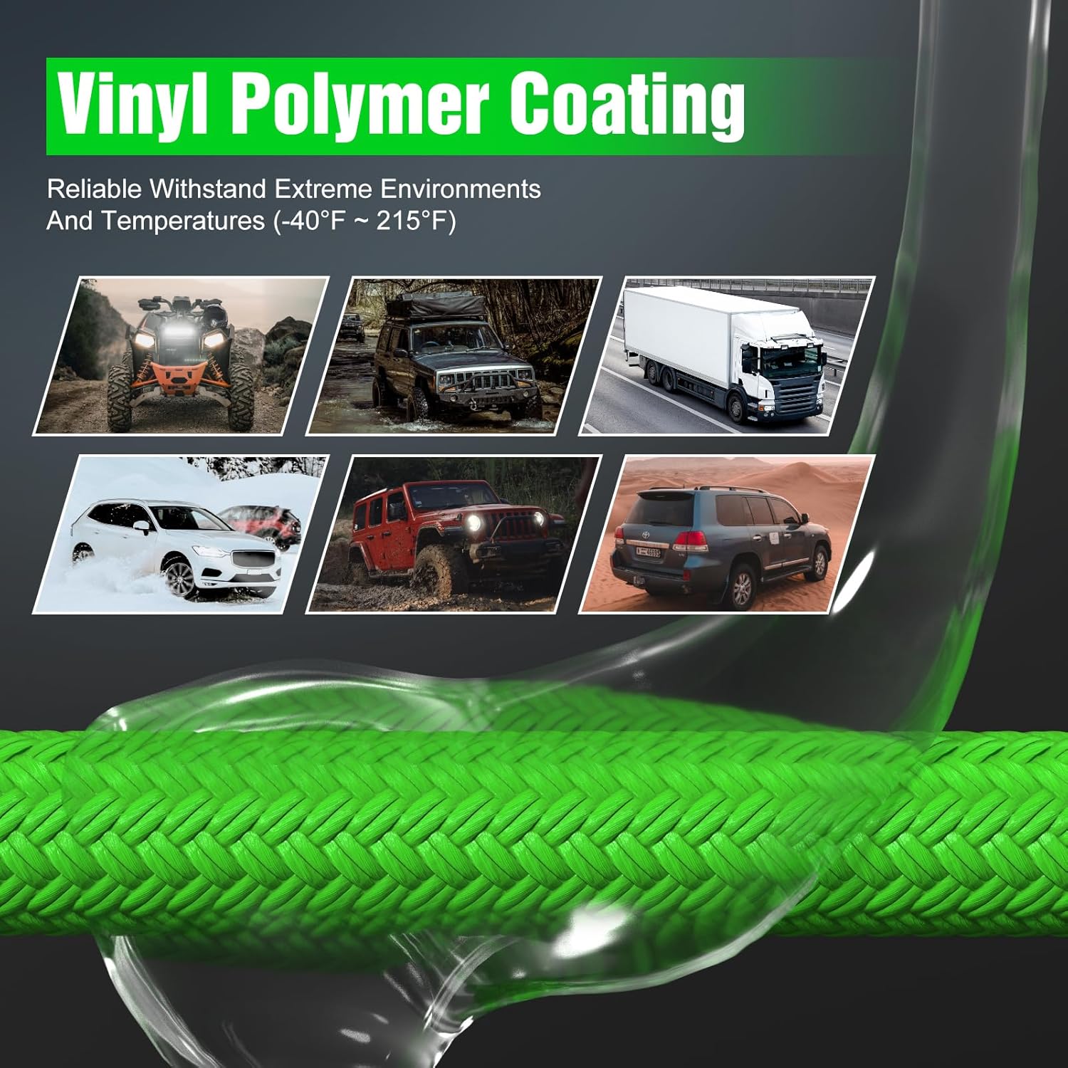 - Double Diamond Braid and Vinyl Polymer Coating: The double braid shell of our recovery strap is infused with a vinyl polymer coating, offering exceptional waterproof and UV-resistant properties. Withstanding temperatures ranging from -40°F to 215°F, it ensures durability in extreme conditions. Additionally, both ends of the nylon kinetic rope feature polyurethane coatings for increased wear resistance, corrosion protection, and easy cleaning.
