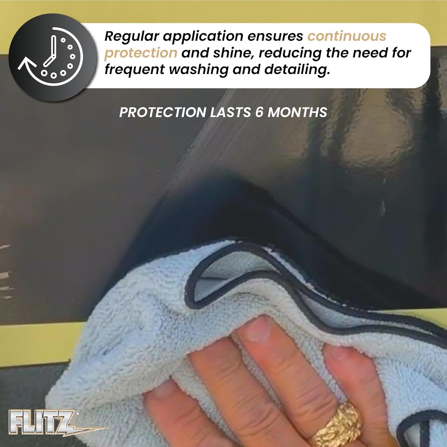 - SHOWROOM FINISH AT HOME - Skip the detailer and get that shine yourself. Just spray onto a clean, dry surface and buff with a microfiber cloth, then let our glass ceramic coating do the rest. For ultimate durability, add a second coat of Flitz sealant spray after 48 hours
