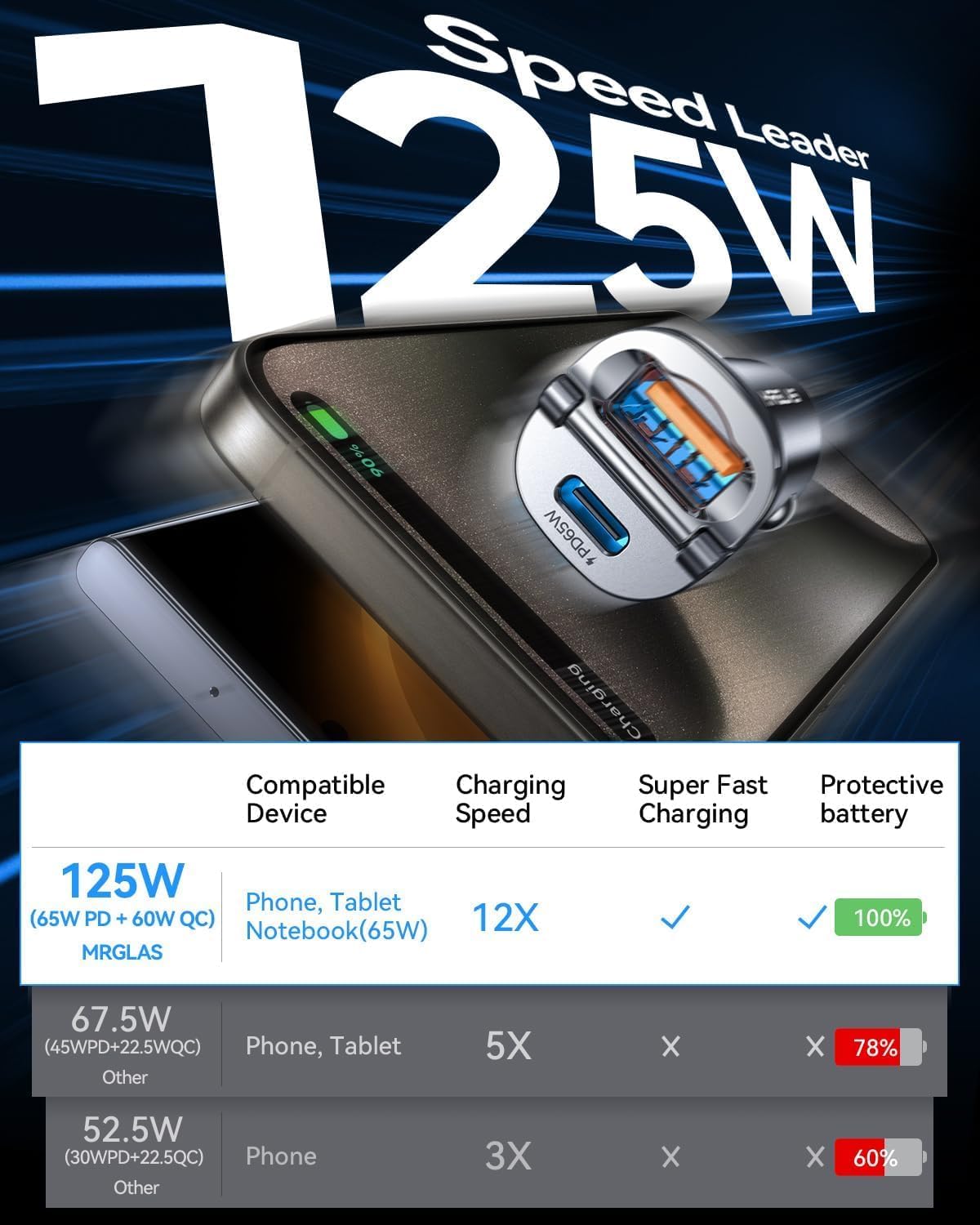 - OFFICIALLY APPROVED PD65W+QC60W FAST CHARGING: MRGLAS 125W fast USB C car charger supporting PD65W(usb-c port) and QC60W(usb-a port) high output, can fast charge all prevailing phones/iPad/tablet at the same time. Makes the IPhone 14 Pro Max and Samsung Galaxy S22 charging time from 0% to 90% in 30 minutes.