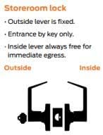 - FUNCTION: Commercial lever door knobs with locks from LO-LOCK HARDWARE are available for specific entrances. This "Storeroom Function" is commonly used in storerooms and mechanical rooms. When the door is closed, it is always locked (rigid) from the outside and requires a key to open. Door is always open from the inside for emergency egress. All Locks are sold keyed differently, but can be easily rekeyed by a local locksmith.