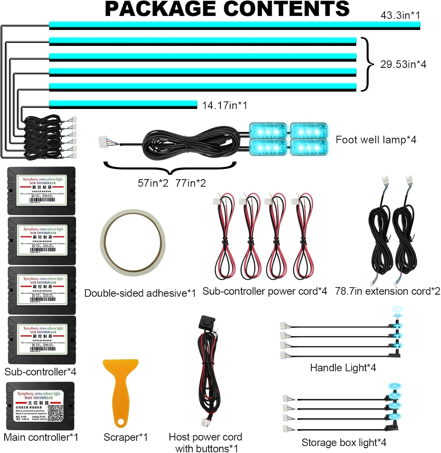 - đźššCar Ambient Light Design: AMKI car led lights includes 6 acrylic fiber optic light strips (1*14inch+4*29.5inch+1*43inch, with 593 LEDs), 4 under dash lights, 4 door handle light, 4 door storage box light, 4 woofer lights, one master controller and 4 slave controller, all required installation tools are included, easy to install,without worrying about exposed wiring or an untidy look.