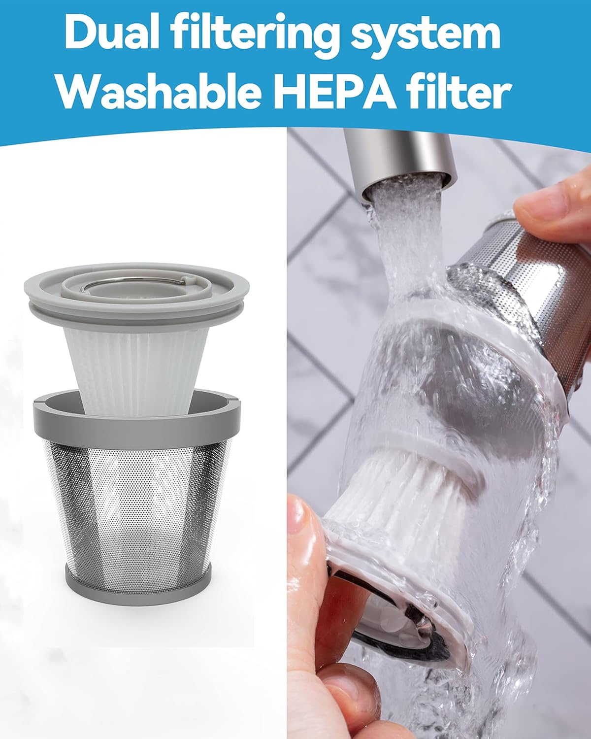 - WASHABLE DUAL-FILTRATION: The stainless steel filter and HEPA filter are washable and reusable.