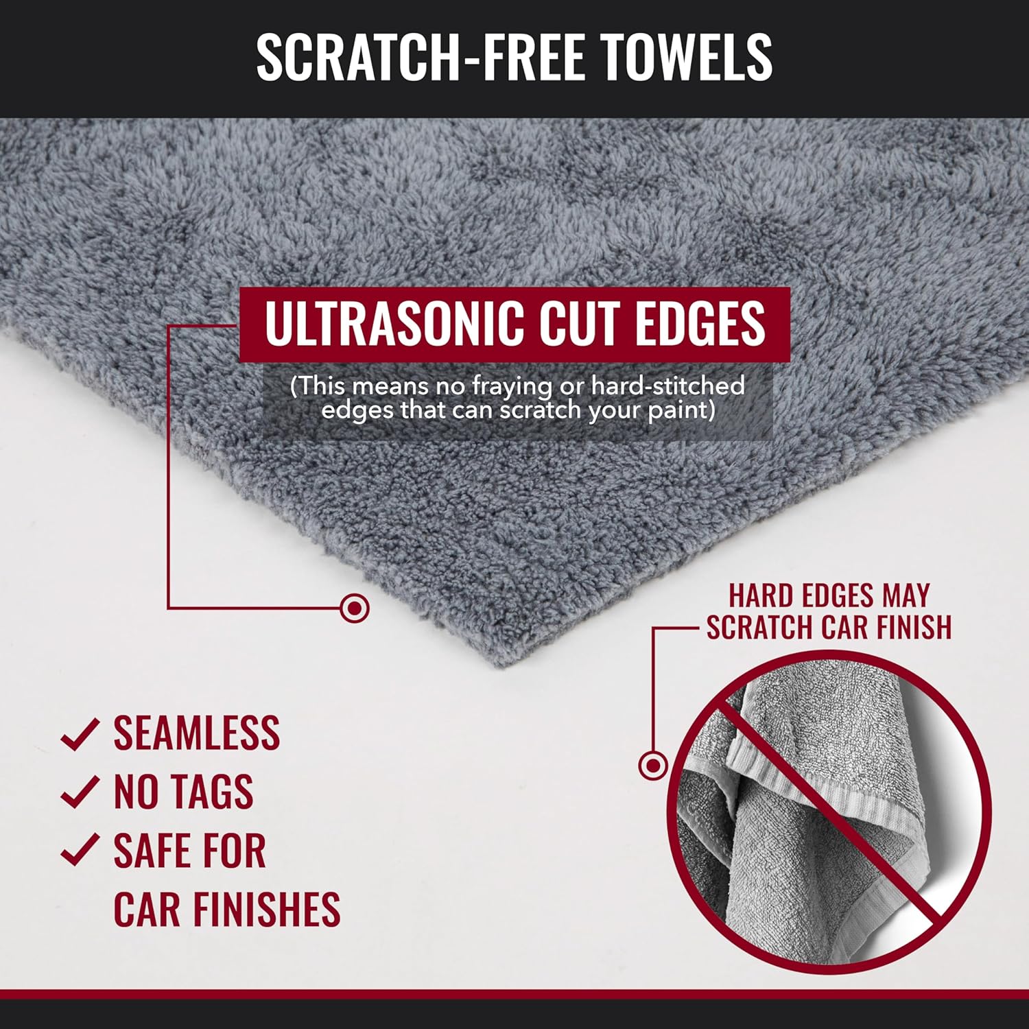 - SCRATCH-FREE DESIGN: With ultrasonic cut edges, our microfiber towels have no hard-stitches or fraying that will scratch your paint. These microfiber rags are safe on all surfaces and are perfect for car detailing, window cleaning, and kitchenware!