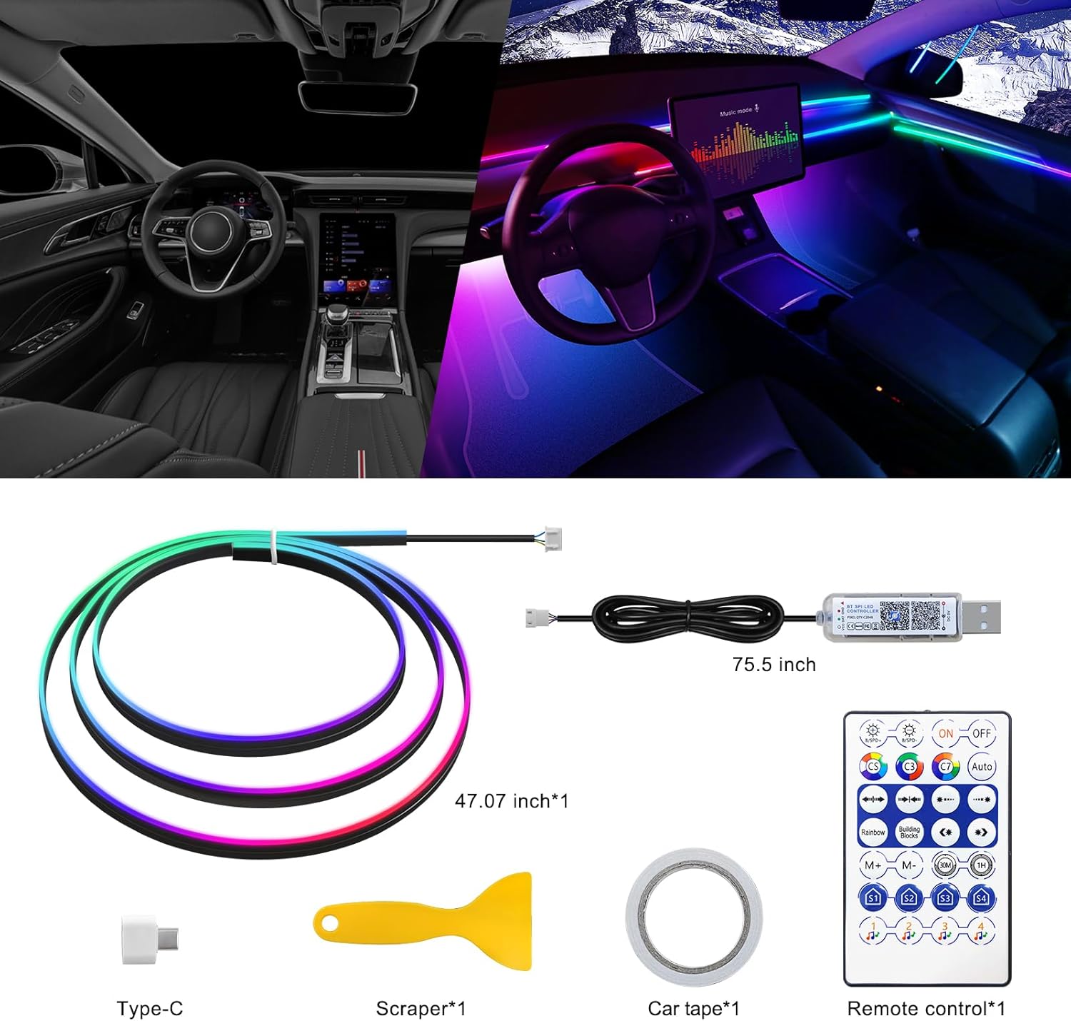 - Included Components : 1*47.24inch Acrylic car light kit, 1*Pry tool, Car Tape*1 +Type-C*1, Remote Control*1