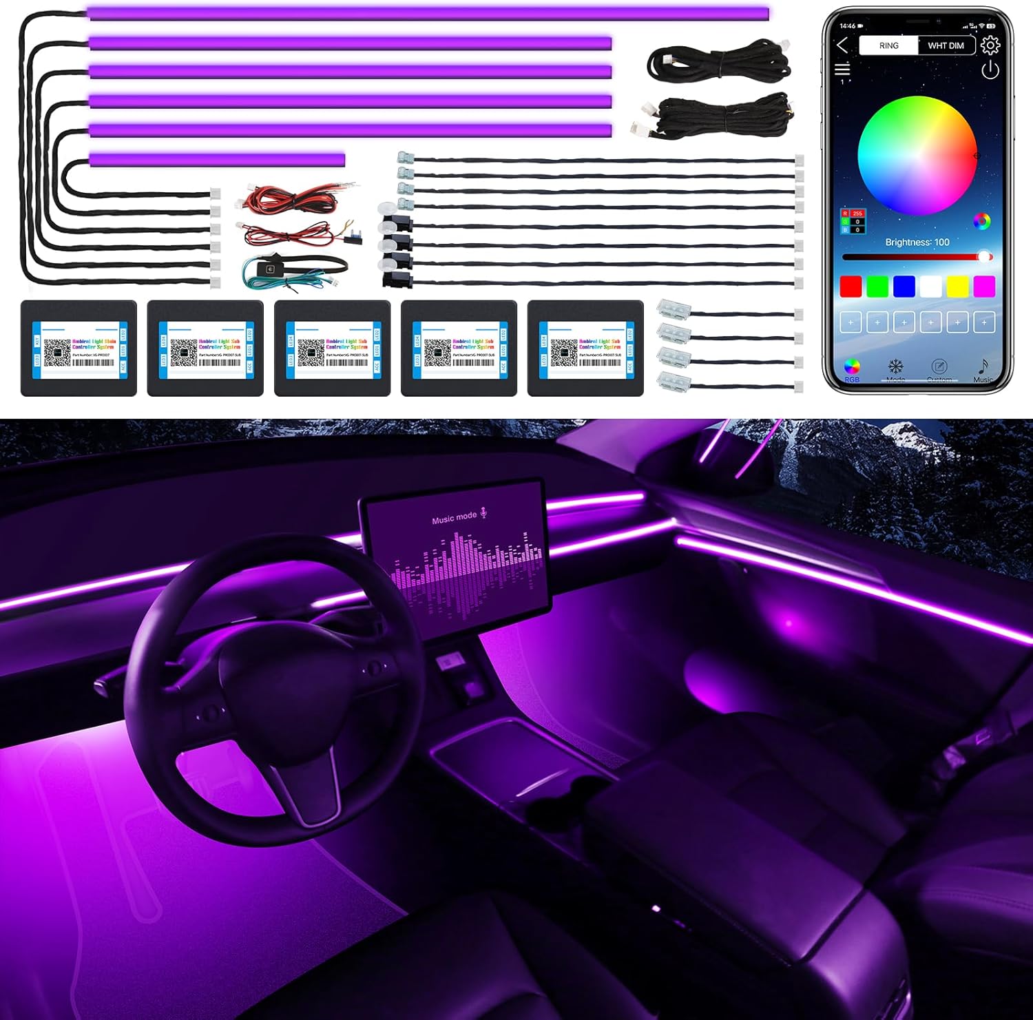 - ăHigh Bright & UniformăThe Acrylic Car Ambient Lighting have super bright LED and acrylic lens and contains 6 LED strips (4*29.5inch+1*43.3inch+1*14inch), Foot well lamp*4(44.5inch*2/64.2inch*2) and Door handle light*4+doors storage box light*4 (19.3+19.3inch), also comes with 1 main controller and 4 sub controllers,and can be flexibly installed on any car by DIY without disorganized, which is plug and play, and this acrylic light evenly spread over the lamp strip is brighter, more uniform and softer than other optical fiber lamps that rely on only one LED.