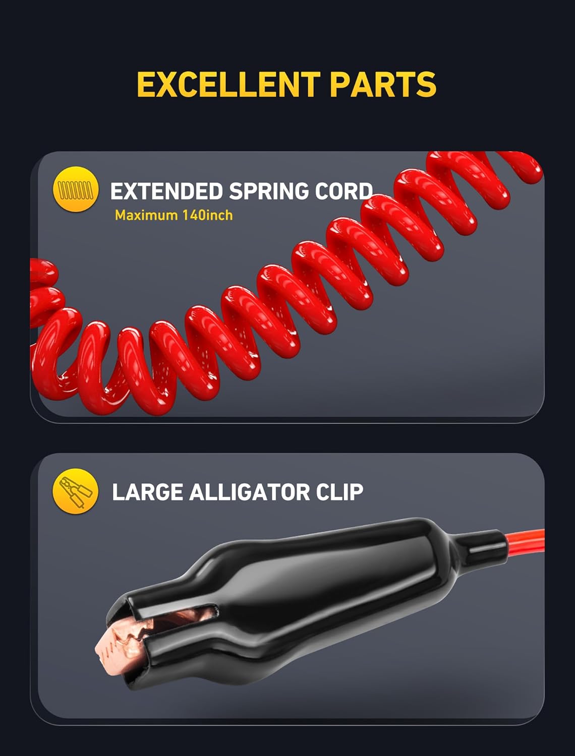 - 【Extended PU Spring & Large Alligator Clip】High quality 140 inch long enough PU spring wire offers more flexibility, lighter and more durable than normal cable wires, heat-insulation and oil resistance for daily use. Attach with large size alligator clip for easy one hand operation, also for convenient use and storage.