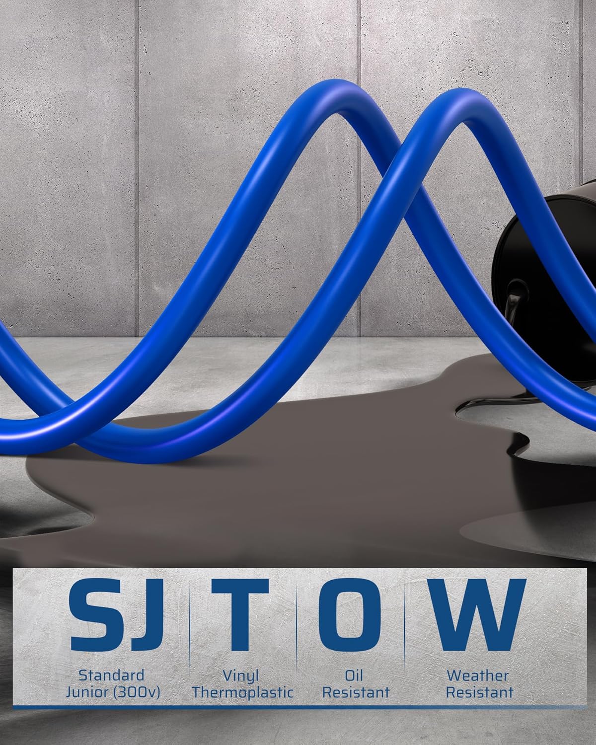 - [14 Gauge SJTOW Cord] The SJTOW electric cord reel, designed with a 14/3C gauge, durable and No breaking after repeated bending; weather-resistant and flexible in low temperature; resistant to UV rays, water, oil, and acid for use in typical garage; NOTE: Please use indoors or in a dry place