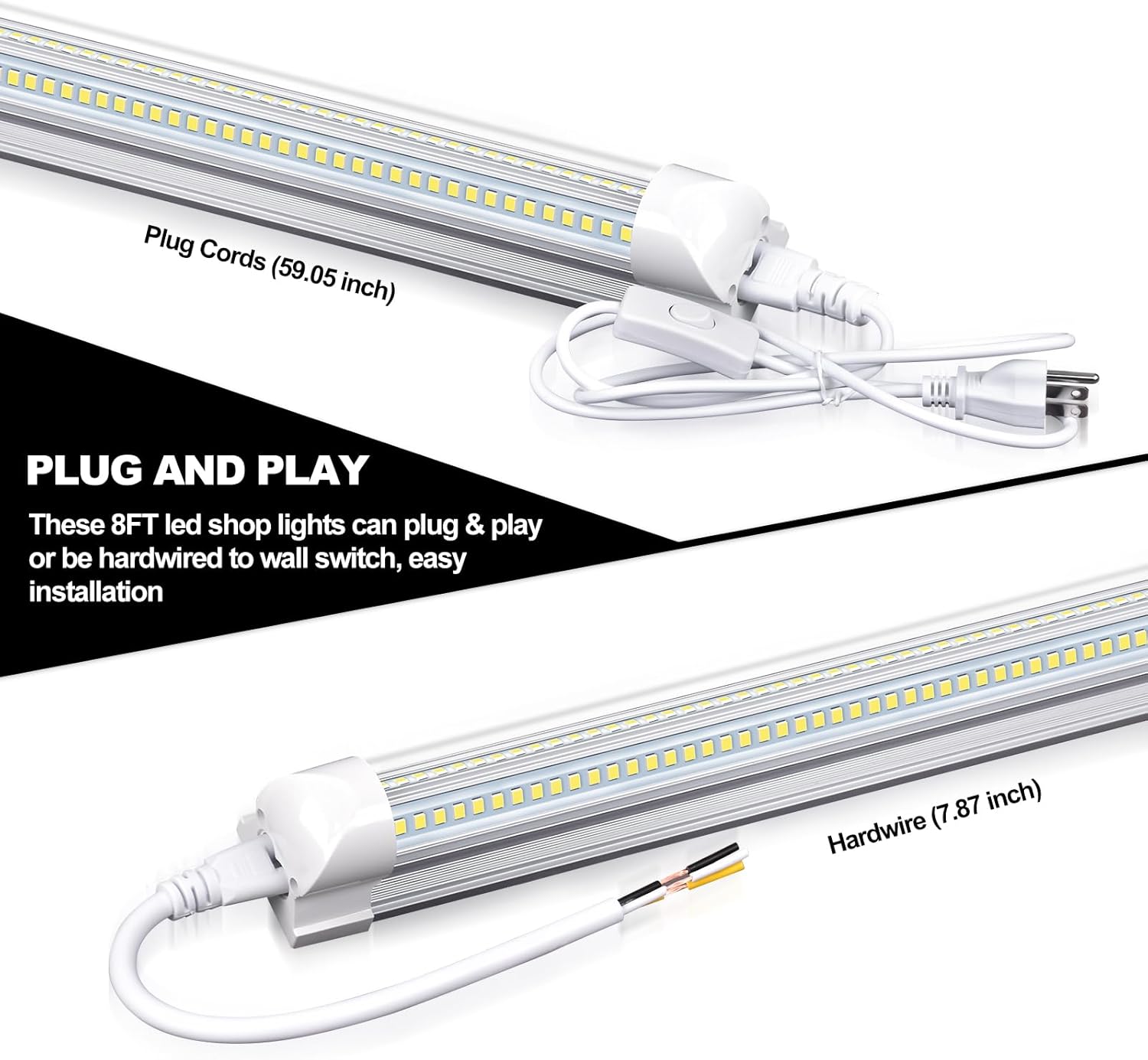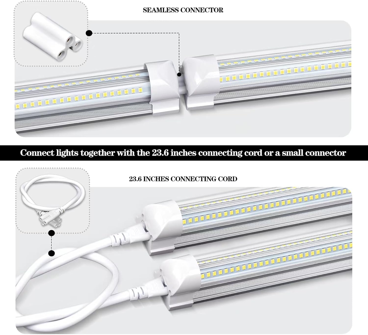 - 【Linkable & Easy Installation】The 4 foot LED tubes feature a linkable design that allows up to 6 tubes to be connected using mating connectors or cables as needed. All required accessories are provided in the package. Simply follow the instructions to install, clip the light tube into the mount clip, connect the power cord with the on/off switch, and you're ready to plug and play