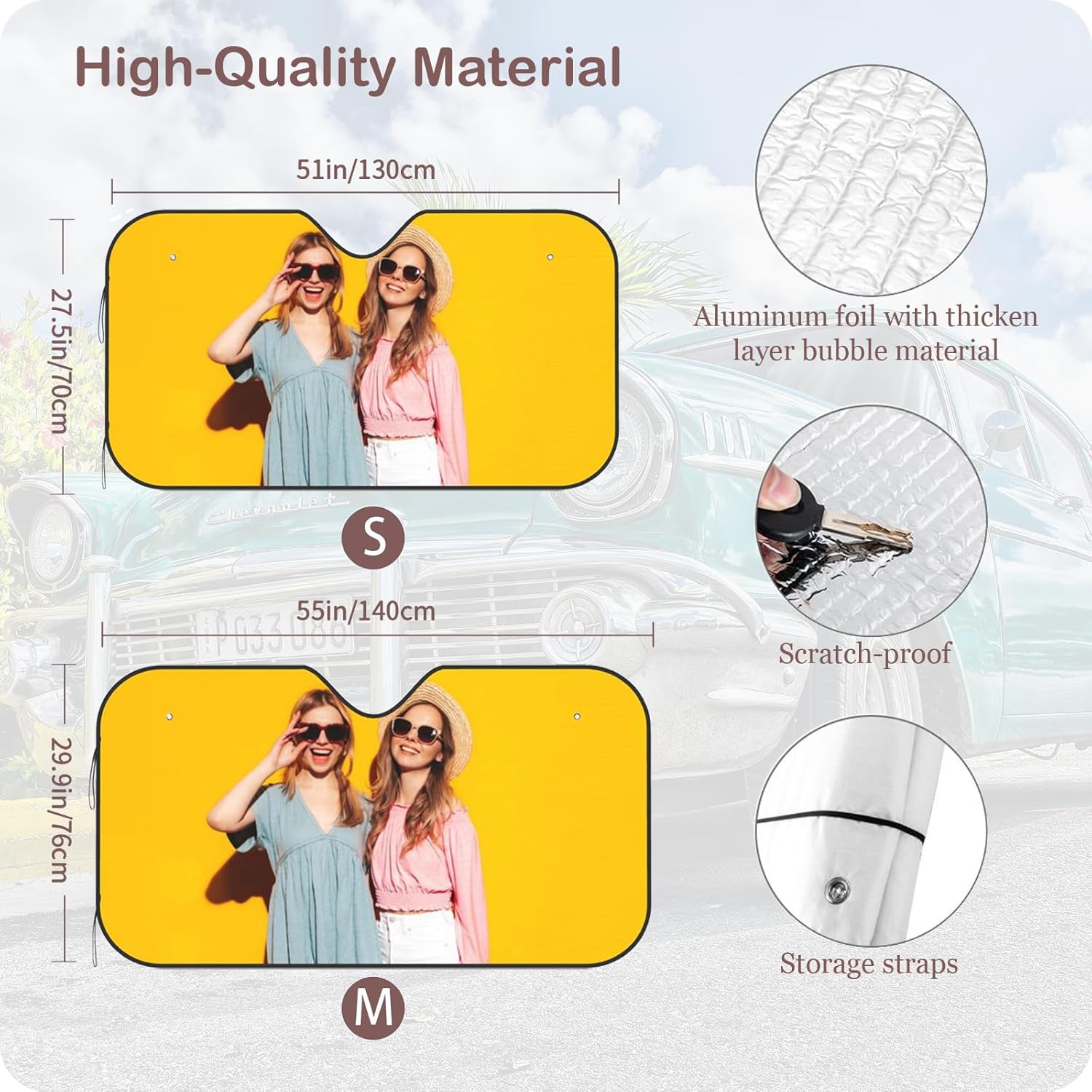 - PERFECT SIZE: Our windshield sunshade small size is 70cm x 130cm/27.5 inches x 51.2 inches and large size is 76cm x 140cm/30 inches x 55 inches. They fit most standard cars, sedans, mid-size SUVs and trucks perfectly. Simply unfold the sunshade and place it under the windshield. Easy to fold, does not take up space in the car, easy to use and simple!