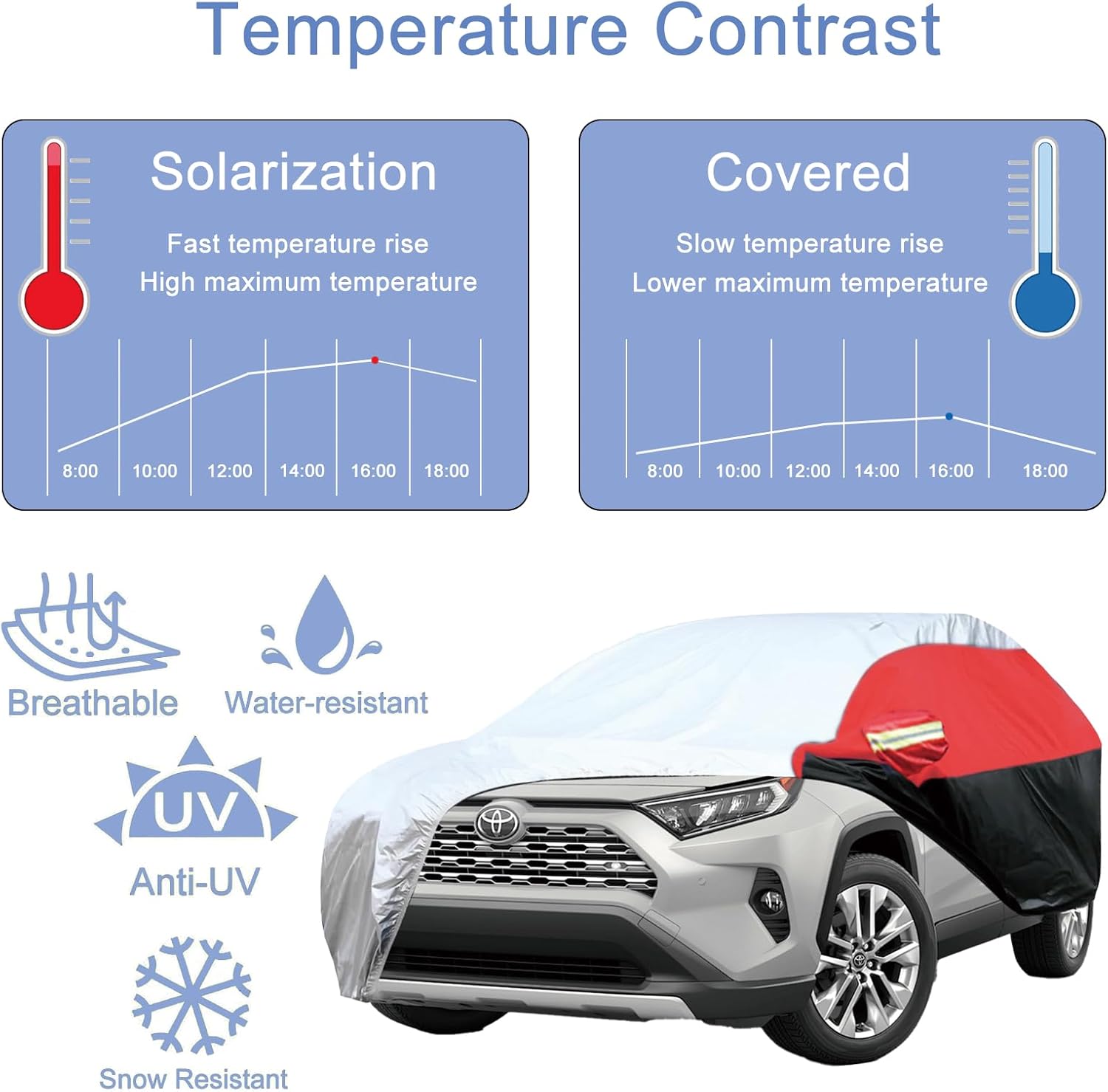 - Waterproof & UV Resistant: Highly waterproof material and UV resistant layer prevent fading and extend the service life of the car cover.Elasticized hem and three fixed buckles provide extra stability and protection against strong winds.