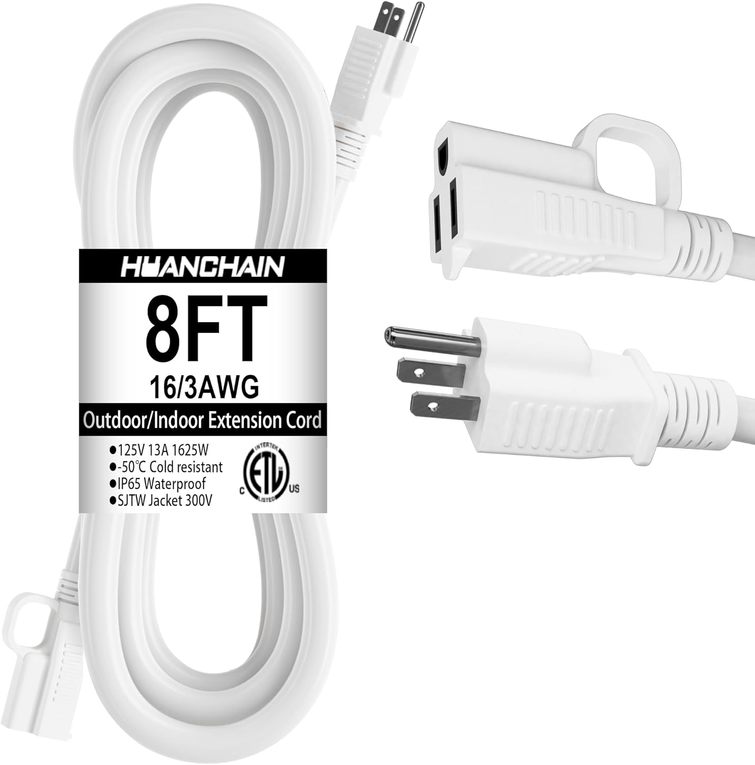 HUANCHAIN Indoor Outdoor White Extension Cord 8 ft Waterproof, 16/3 Gauge Flexible Cold-Resistant Appliance Extension Cord Outside, 13A 1625W 16AWG SJTW, 3 Prong Heavy Duty Electric Cable, ETL