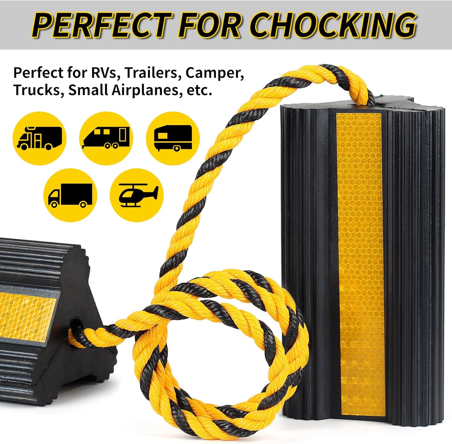 - Dimensions: Single wheel chock block dimensions 8.3" L x 4.4" W x 4" H; Rope length 52” (132cm); 1 pair weight 7.5lb (3.4kg)