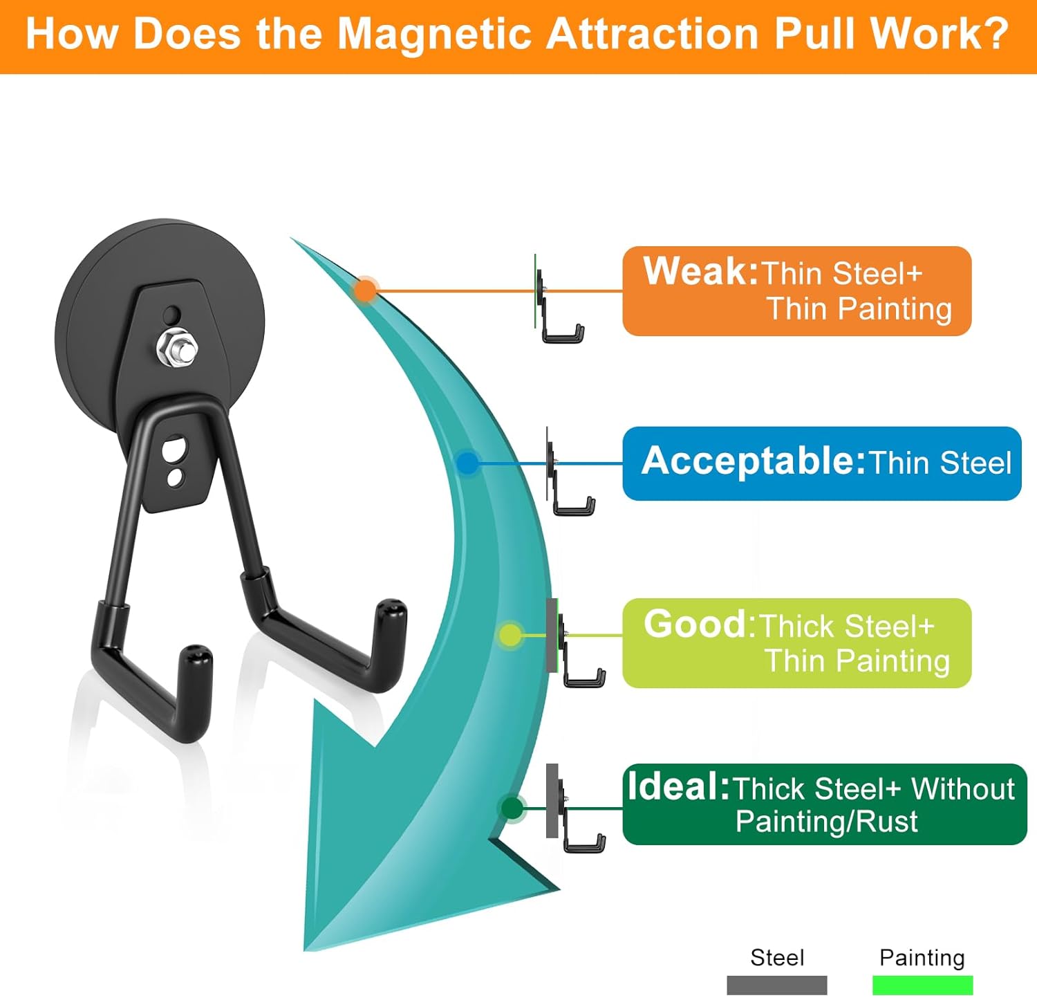 - Hold up to 7~10 lbs magnet hooks: The magnetic garage hooks are ideal when dealing with steel surfaces. Each hook is embedded with 6 super strong rare earth magnets inside a 2.59-inch round base, providing a strong grip when hanging tools.