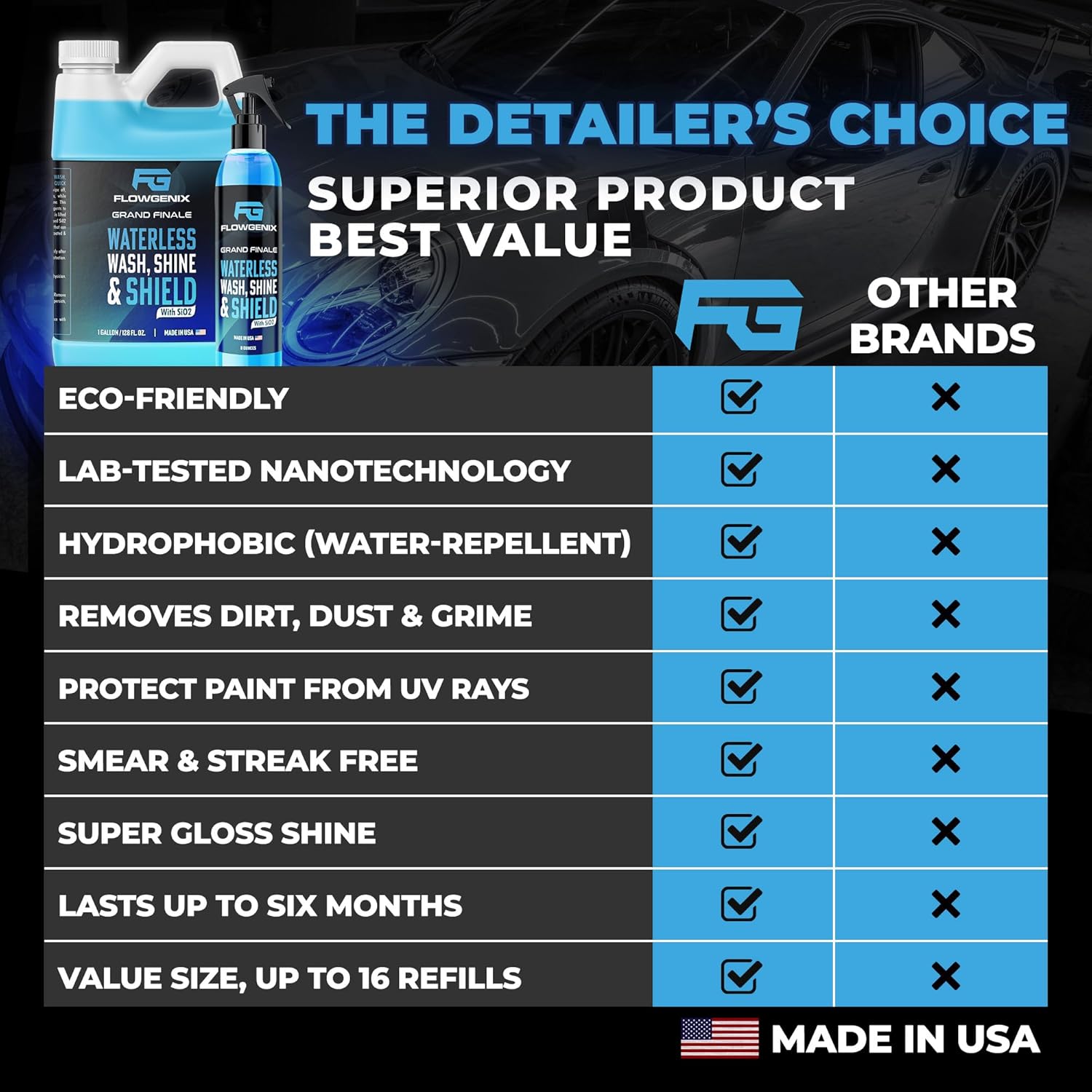- 🚘 BREAKTHROUGH DETAILING PROTECTION: Flowgenix Grand Finale is a detail spray car care kit that cleans, shines, and protects. Its formula dissolves dirt on contact and provides long-lasting protection. Extremely hydrophobic, it repels water and eliminates the need for a water wash and soapy messes!