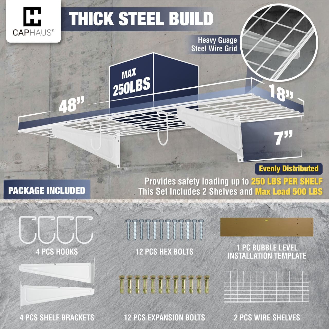 - 🔨 Various Size Choices - This option includes TWO wall shelves, FOUR Versatile hooks, and all necessary hardware. Each shelf measures 48 inches in width and 18 inches in depth, providing a total of 96 inches in width. Opt for the silver hex bolt for concrete and wooden walls and choose the golden expansion bolt for secure installation on brick walls. Heavy gauge steel construction provides safety loading up to 250lbs total per shelf, this set providing a total weight capacity of 500 lbs.