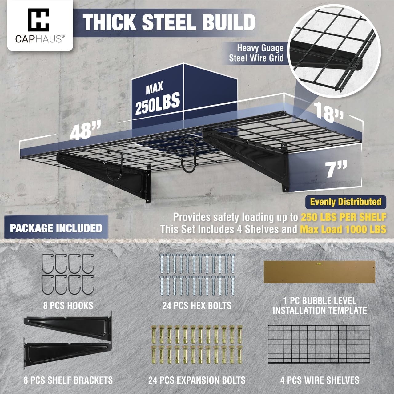 - 🔨 Robust Steel Construction - Our garage wall shelving set includes wire shelving and wall brackets with a durable powder-coated finish, marrying a sleek look with sturdiness. The intelligent design of our steel storage rack allows overhead storage and accessory hook usage, maximizing garage space and organization. We provide high-quality screws that have undergone rigorous testing to ensure durability. Each hook included in the package has a weight capacity of 33 lbs.