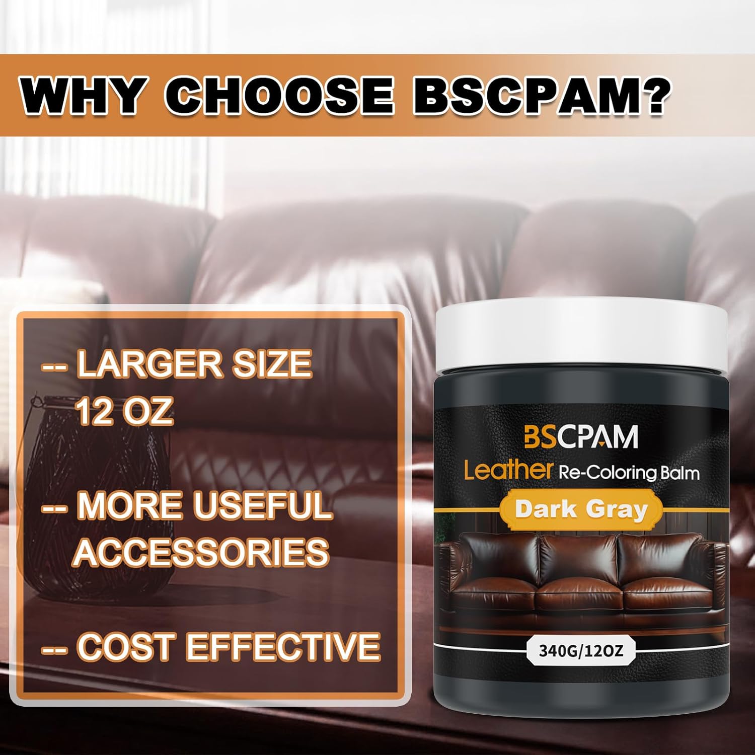 - Easy to Use: Our BSCPAM Dark Gray Leather Repair Kit for furniture includes a 12oz leather repair gel, three sponges, a paintbrush, a scraper, and gloves. Simply apply the colorant and let it dry naturally for 10-20 minutes, or speed up the process with a hairdryer for 1-2 minutes. (We recommend testing on a small area before full application.) It quickly restores your leather's original shine.