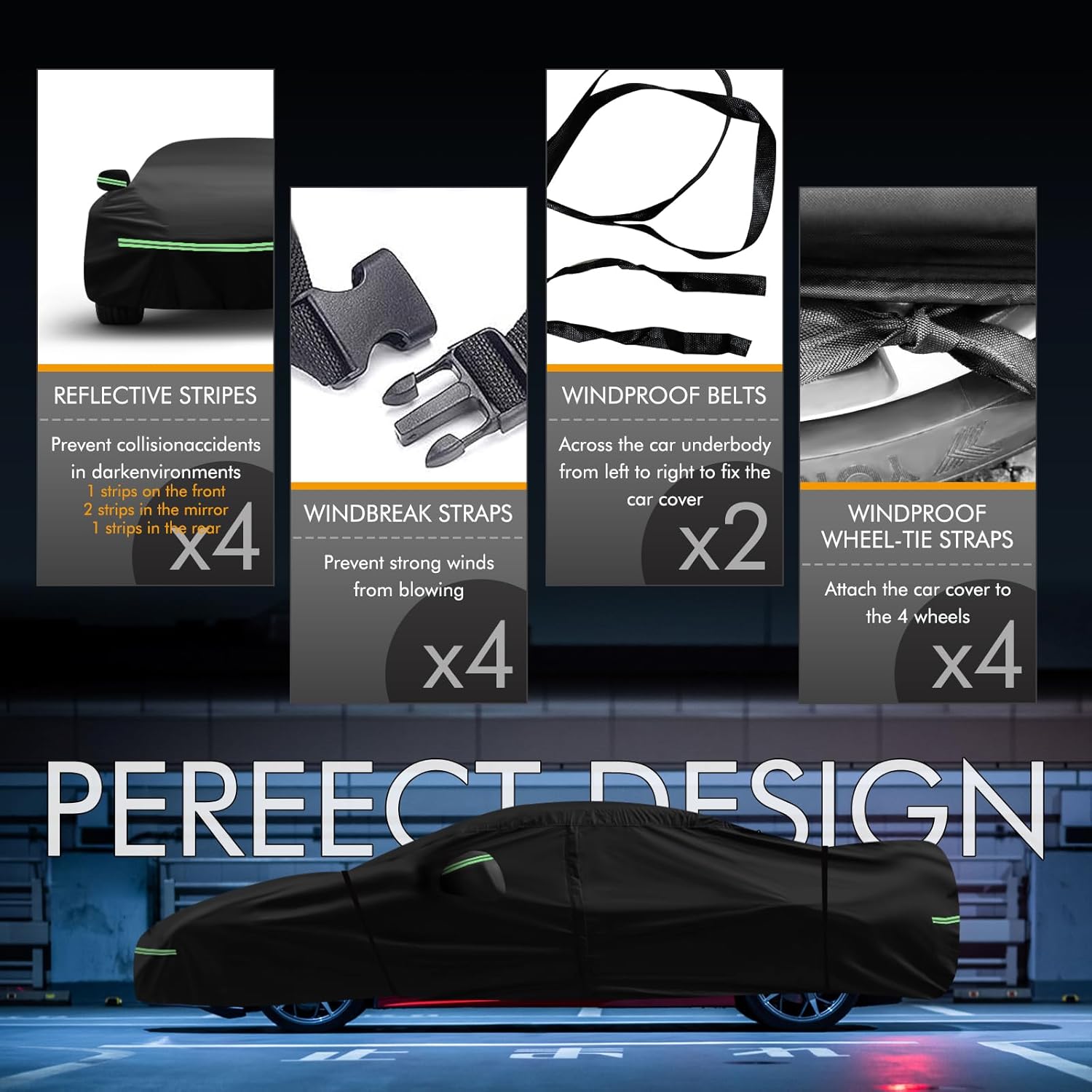 - đăSafety and Humanizationăâ The car protection cover has a zipper on the driver's side to facilitate temporary access to items; âĄThe four reflective strips are located at the front, rear and the two side mirrors of the car to prevent nighttime collisions and other accidents; â˘Custom fit shape with 2 mirror pockets for all-around protection.