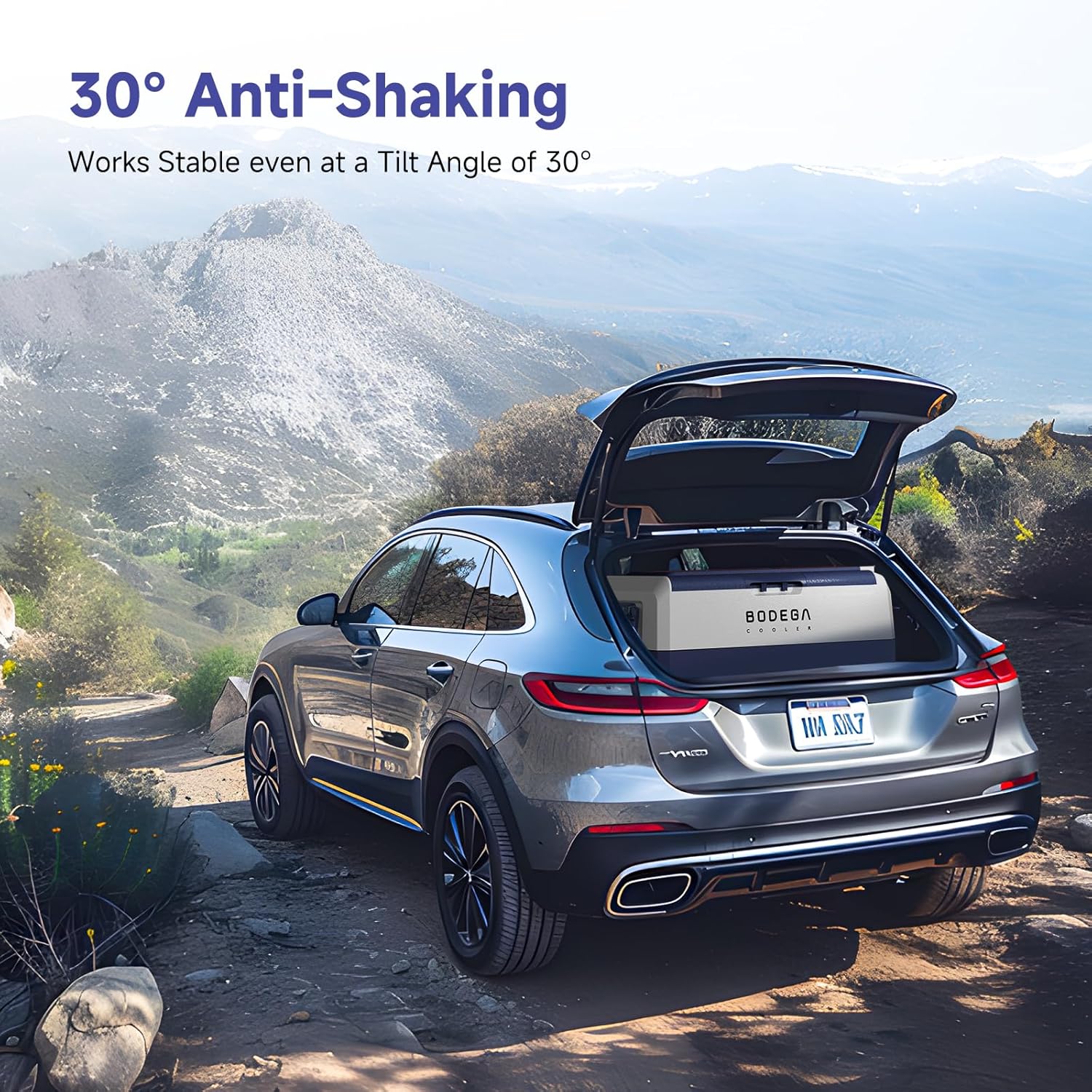 - ANTI-SHAKING: BODEGACOOLER 12v fridge provides a silent and comfortable environment for you.Because of its overall external smooth lines and equipped with a multi-functional non-slip base, the lateral displacement is greatly reduced. When your car is climbing at an inclination angle of 30 degrees, the car portable freezer can still run stably.Our portable car refrigerator allows you to enjoy cold drinks in stable and quiet during the trip.