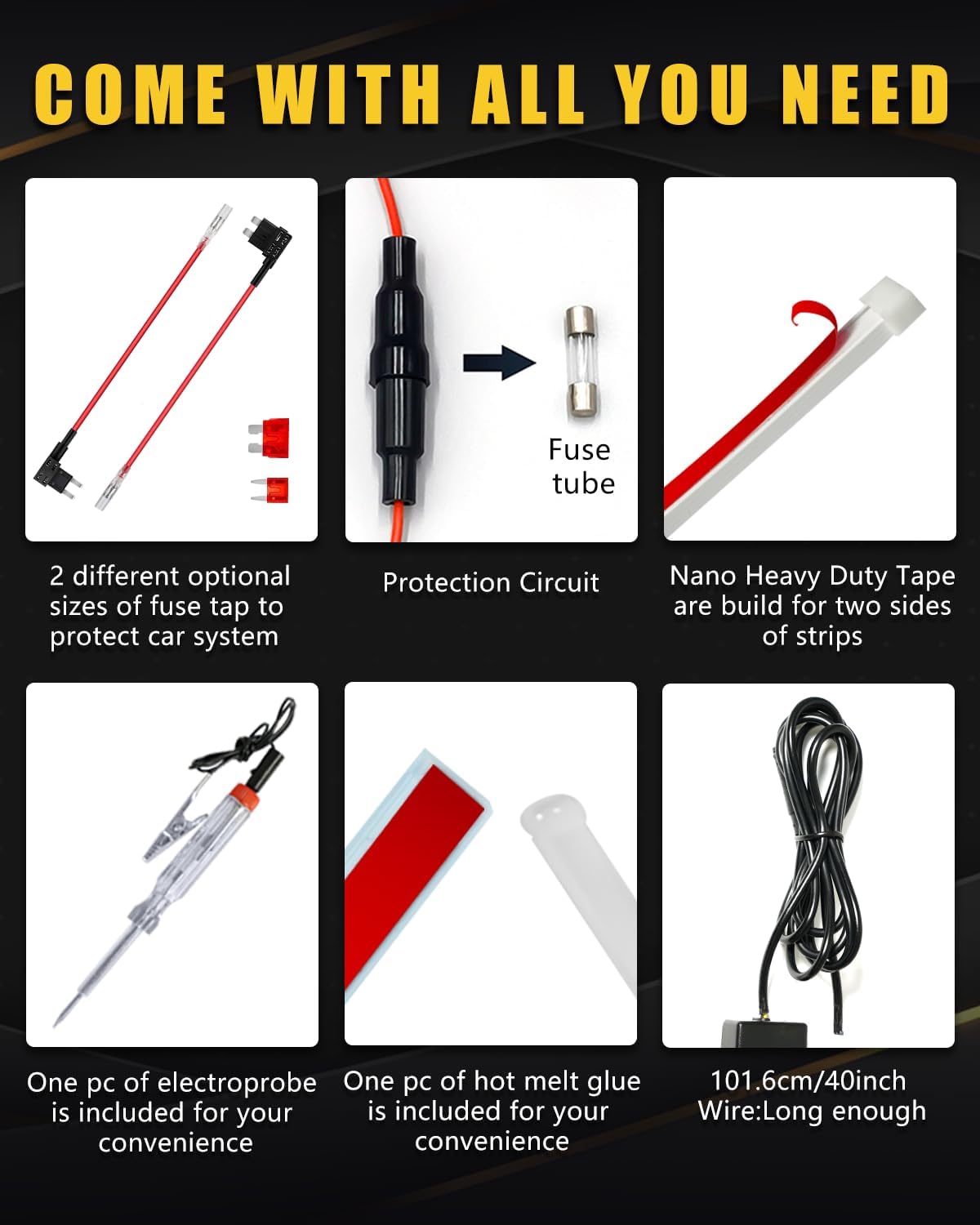 - Special Feature : Package includes one test pencil,one hot melt glue stick., Soft & Bright Light ,No Dark Spots, Two sides of Strip are Build with heavy duty Nano Tape, With 40 inches wire, With Fuse Tap Adapters for protection circuit Package includes one test pencil,one hot melt glue stick., Soft & Bright Light ,No Dark Spots, Two sides of Strip are Build with heavy duty Nano Tape, With 40 inches wire, With Fuse⌠See more