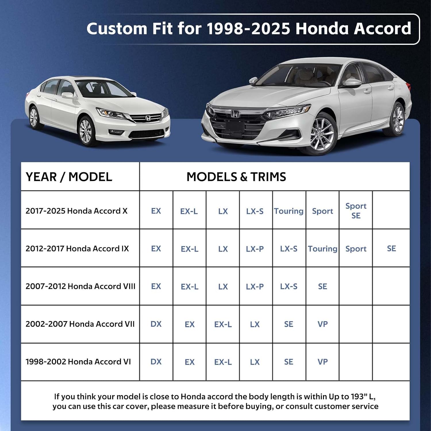 - ăPerfect Fităâ Holthly has conducted experiments to obtain a customized car cover specifically designed for Honda Accord (2001-2024). The custom-like fit of the full cover not only enhances the -aesthetics of your vehicle but also provides superior wind resistance, thereby prolonging the lifespan of the hood. It offers enhanced and long-lasting protection for your car.