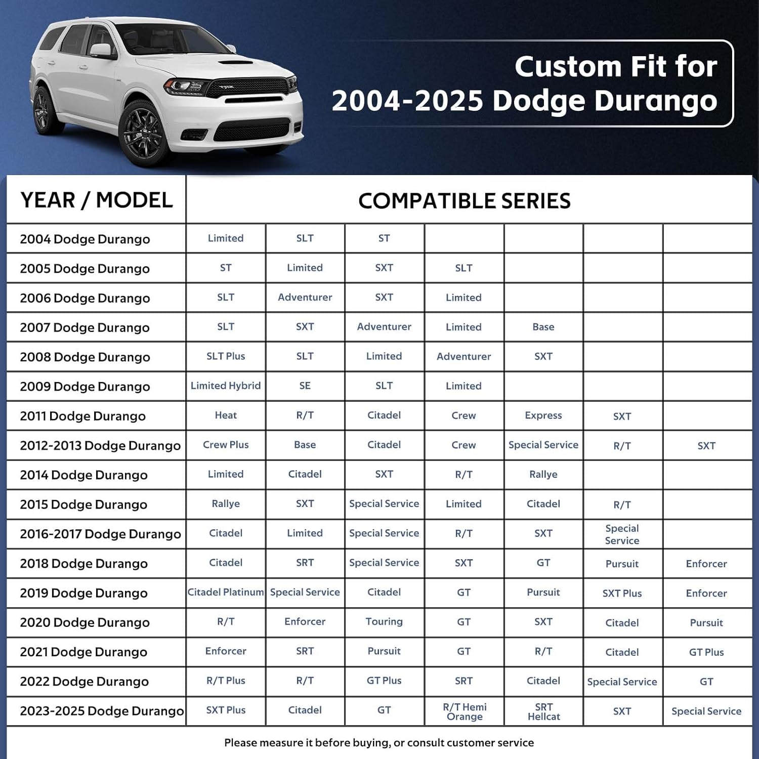 - ăPerfect Fităâ Holthly has conducted experiments to obtain a customized car cover specifically designed for Dodge Durango (2004-2024). The custom-like fit of the full cover not only enhances the -aesthetics of your vehicle but also provides superior wind resistance, thereby prolonging the lifespan of the hood. It offers enhanced and long-lasting protection for your car.