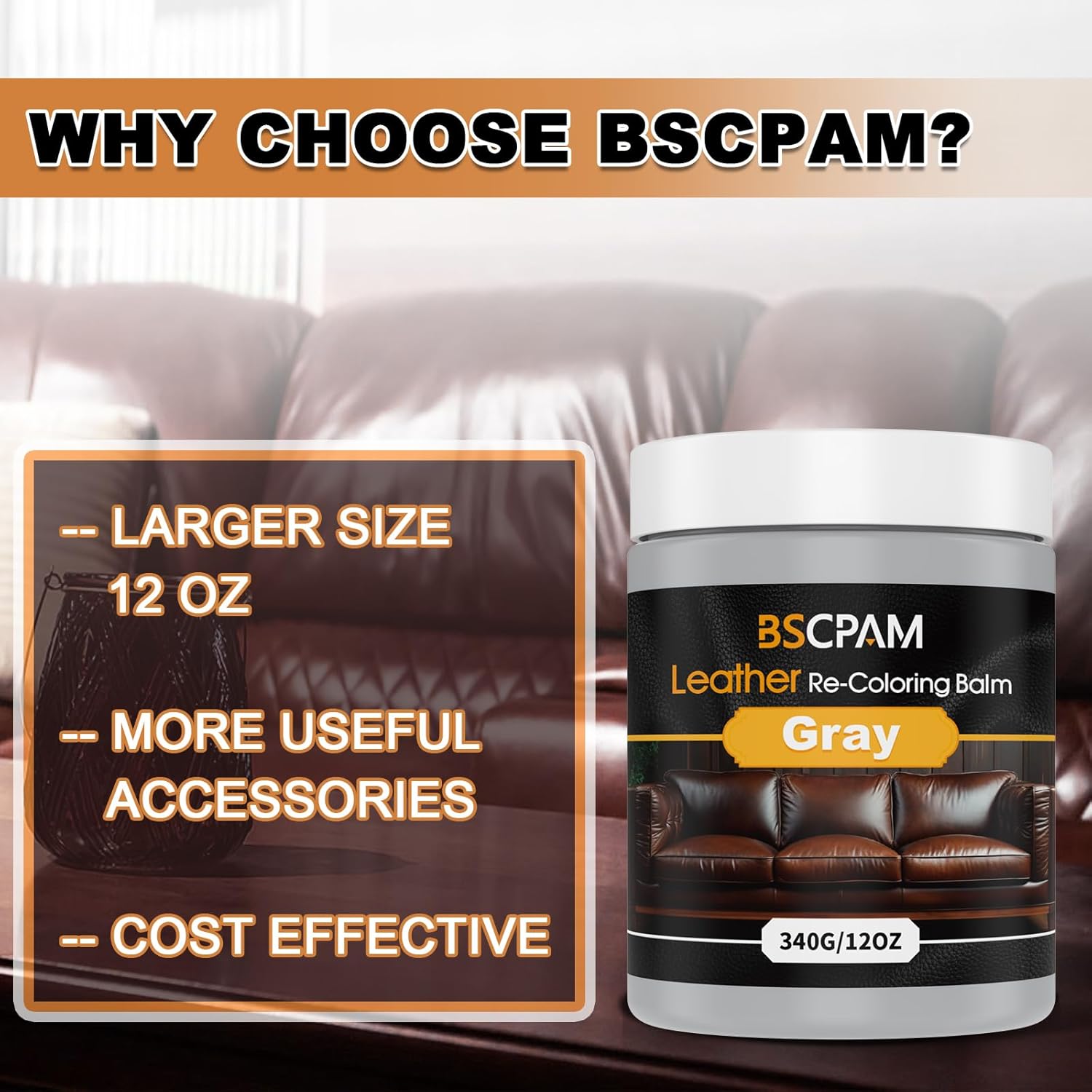 - Easy to Use: Our BSCPAM Light Gray Leather Repair Kit for furniture includes a 12oz leather repair gel, three sponges, a paintbrush, a scraper, and gloves. Simply apply the colorant and let it dry naturally for 10-20 minutes, or speed up the process with a hairdryer for 1-2 minutes. (We recommend testing on a small area before full application.) It quickly restores your leather's original shine
