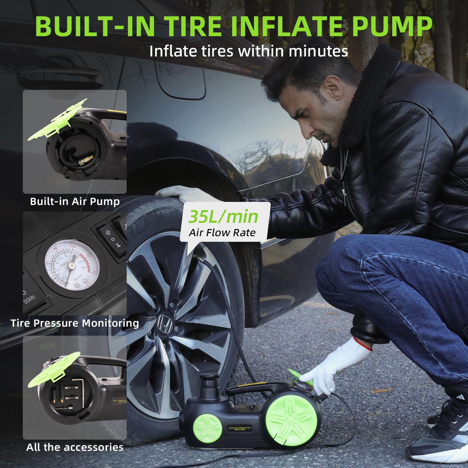 EFFIROSO Electric Car Jack Kit 5 Ton 12V Hydraulic Floor Jack with Impact Wrench Tire Inflator Pump for Vehicle Emergency Repair Kit 11023lbs (Black and Green)
