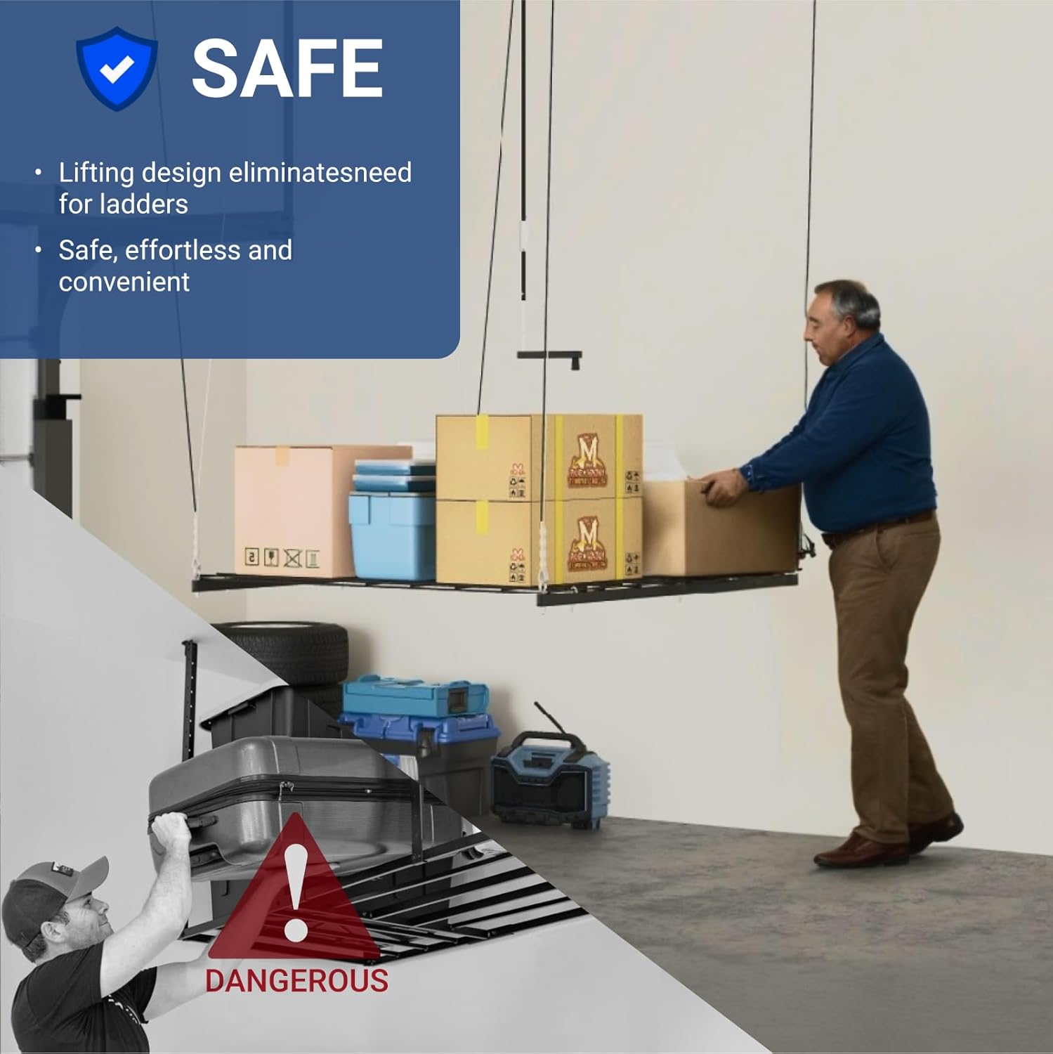 - MAXIMIZE GARAGE SPACE: The 4x4 ft deck offers you with the perfect garage storage solution, protecting your belongings and using garage ceiling space to store seasonal and unused items.