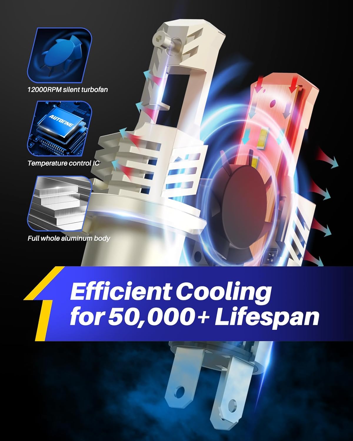 - No More Frequent Replacement -High speed silent cooling fan, whole aviation aluminum lamp body and unique hollow heat dissipation design helps to dissipate the heat generated from the L E D chips rapidly and effectively. It ensures the h4 bulbs work steadily and continuously up to 50,000 hours