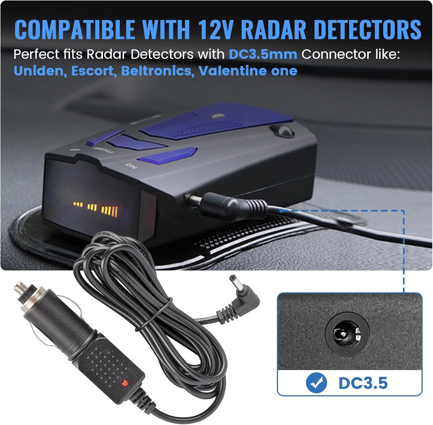 - Easy Installation: - No complex hardwiring issues, direct plug and play radar detector power supply cord is about 6.5 feet long, design for DC "3.5" jack Laser/Radar Detectors
