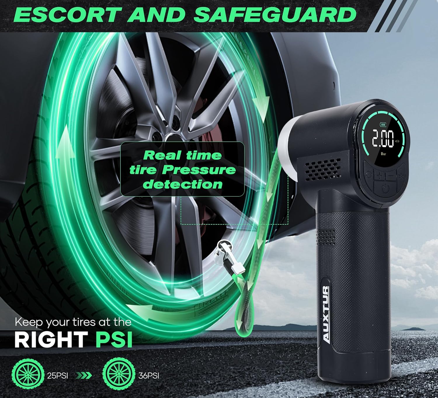 - Accurate and Convenient: Equipped with a digital tire pressure gauge, monitoring and presetting tire pressure has never been easier. The LCD screen provides clear and precise readings for accurate inflation every time.