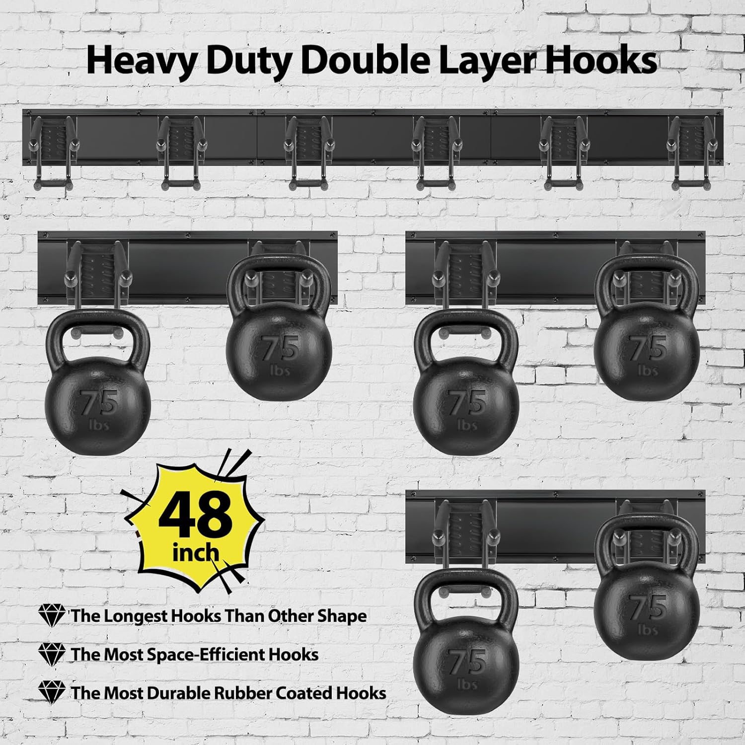 - EASY TO RELOCATER & ADJUSTABLE: The garage wall organizer has 3 Steel wall racks (16 inch), 6 Double UP-DOWM Hooks (10 inch) which are equivalent to 12 double hooks (6 long hooks and 6 short hooks). These hooks can be effortlessly repositioned anywhere along the tracks of the panel to accommodate changing storage needs. Allowing you to customize your storage setup with ease.