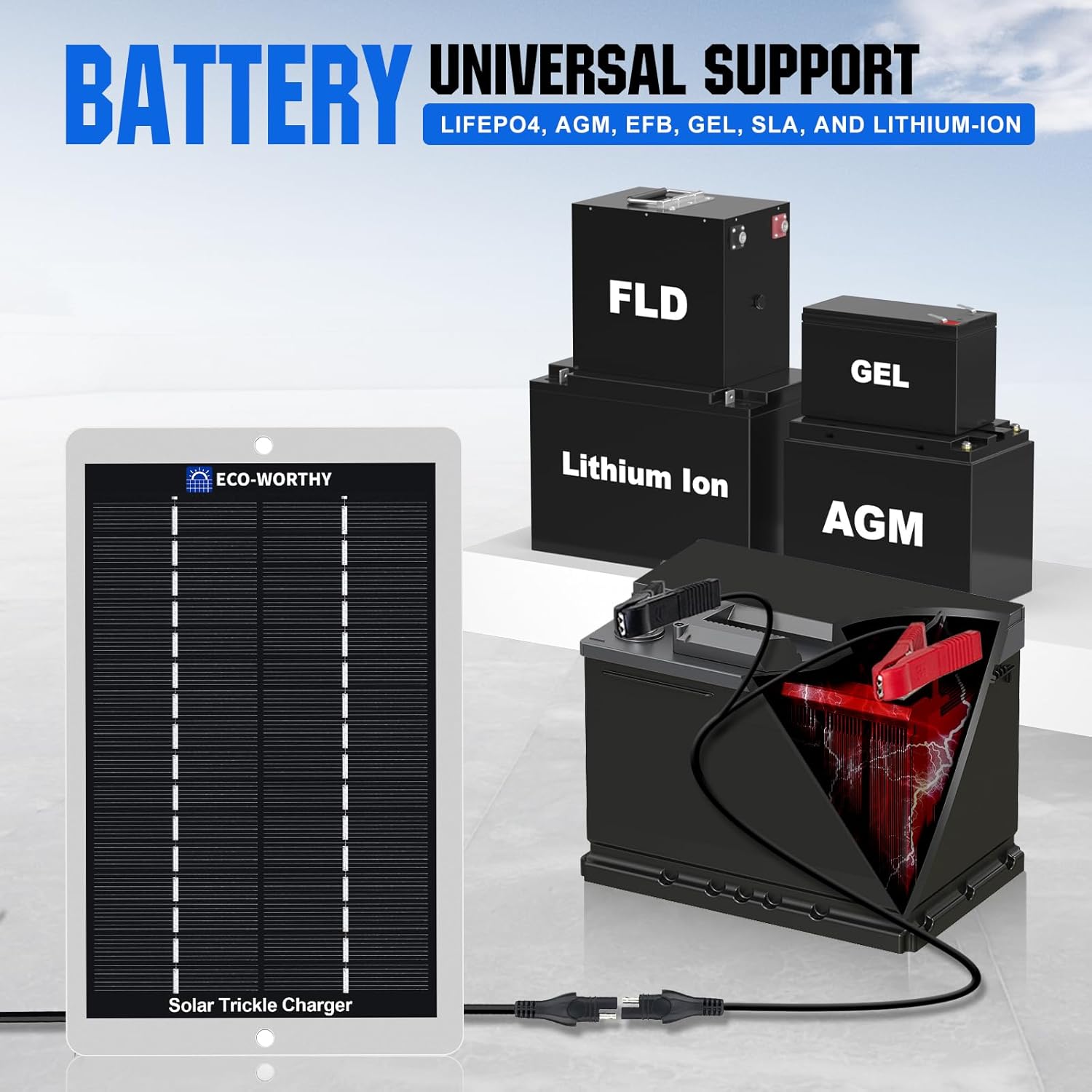 - [Built-in Blocking Diode] The charging algorithm is upgraded, and the charging efficiency is increased by 20%-30%. Provides multiple protections such as overcharge protection, over discharge protection, reverse polarity protection, etc.