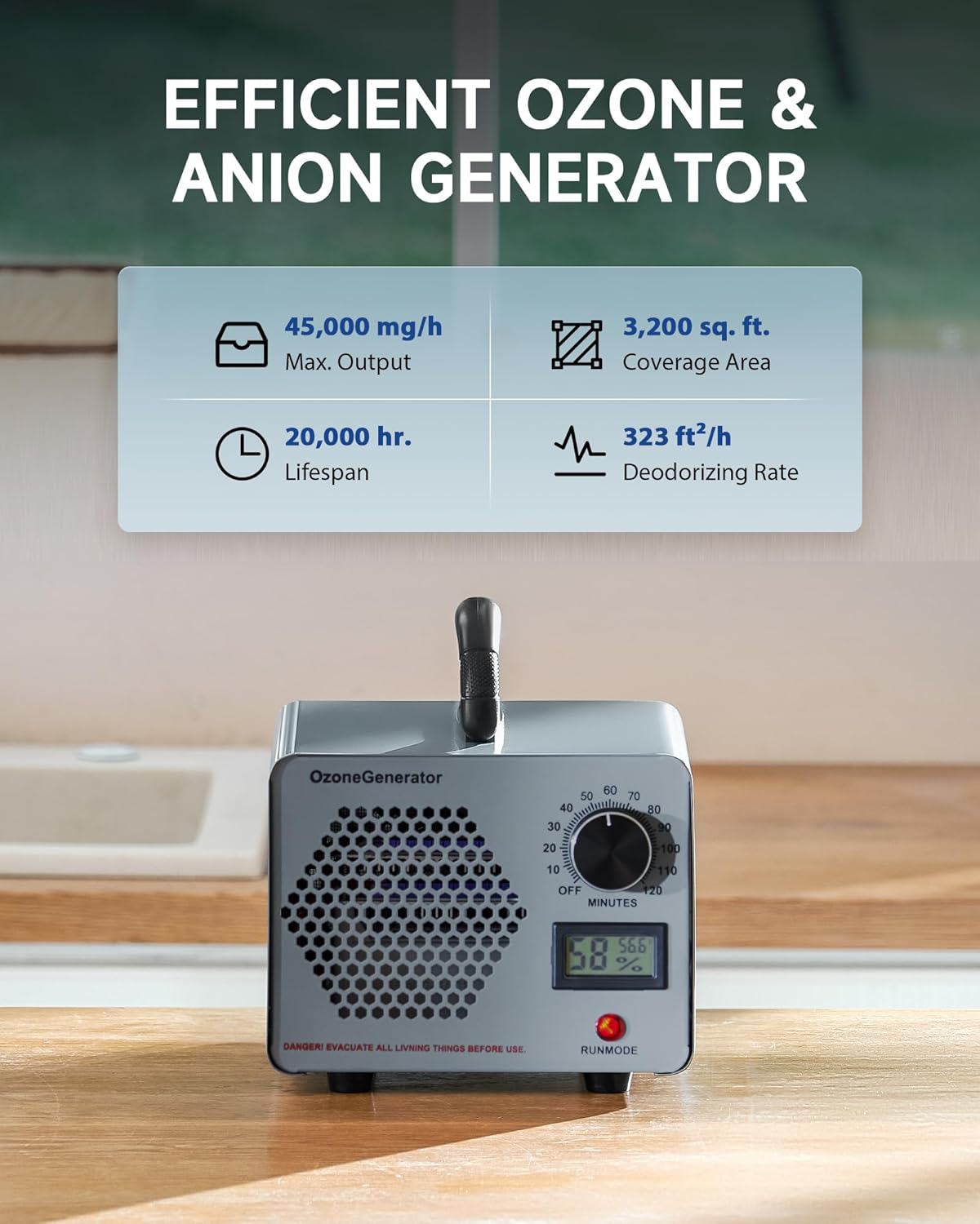 - Powerful Deodorization: With a maximum ozone output of 60,000 mg/h and a 2800 rpm fan, this ozone machine can effortlessly deodorize a space of up to 3200 square feet