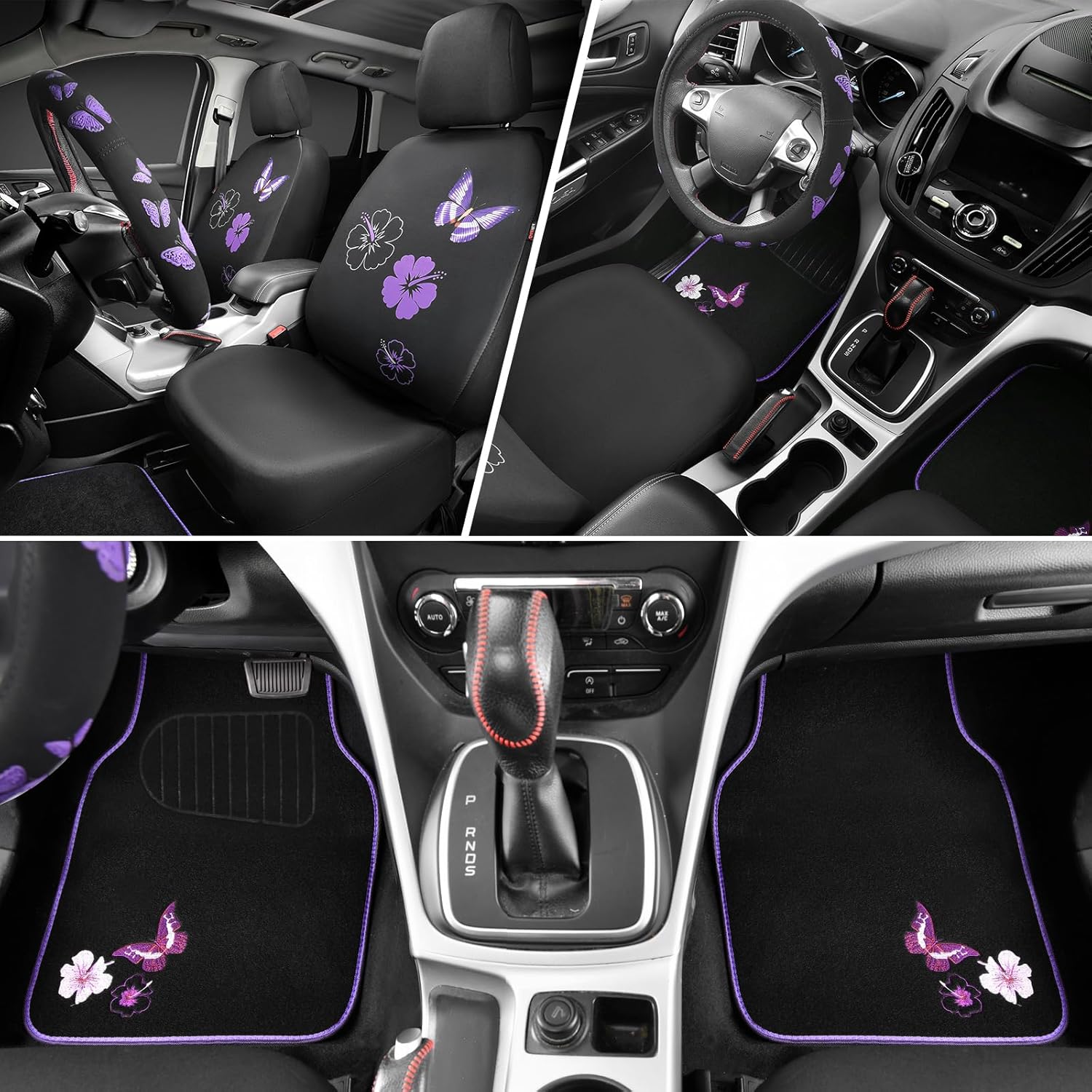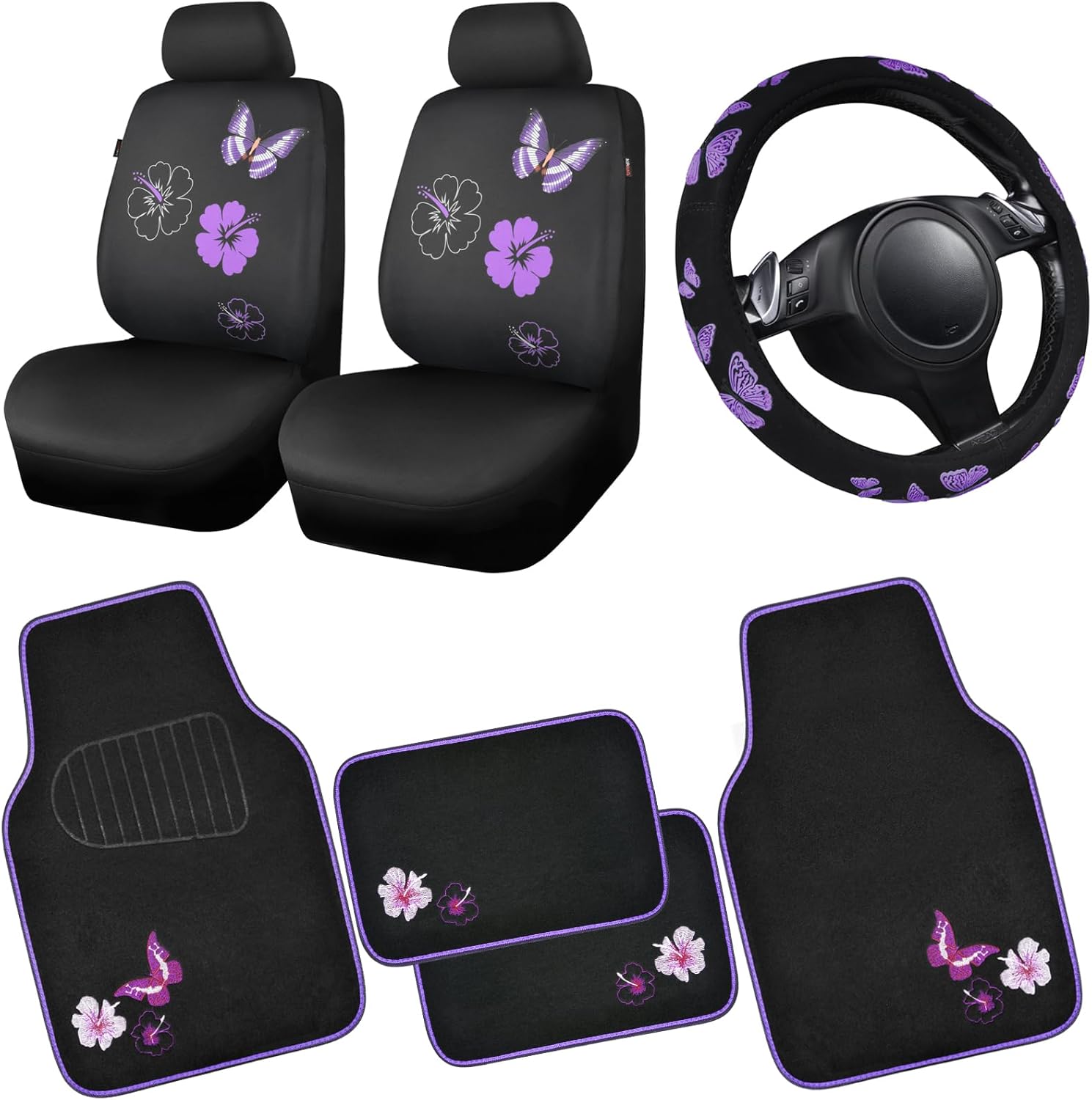- ăComplete Car Interior AccessoriesăIncludes 2 front set of butterfly seat covers, 4 butterfly floor mats and a butterfly steering wheel cover to give your car a new look.