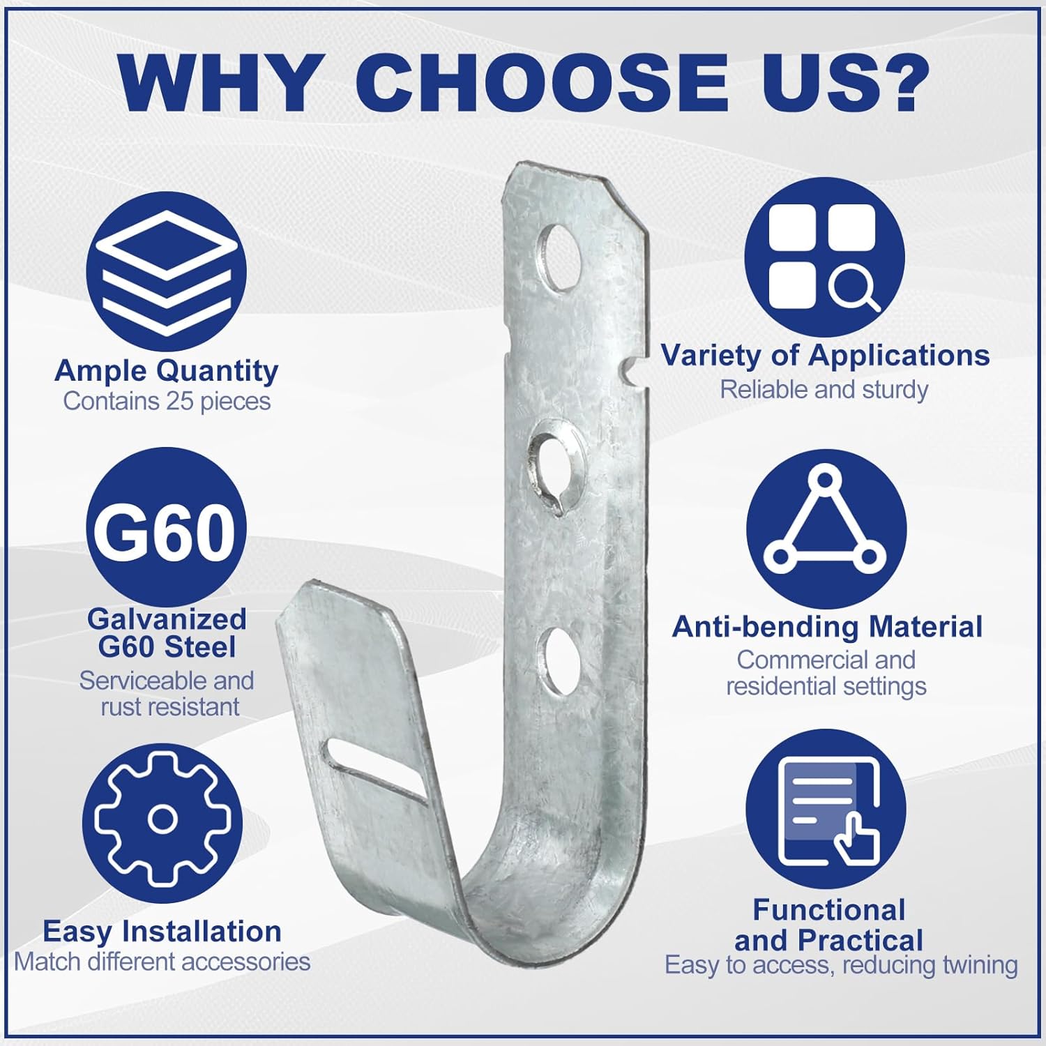 - Functional and Practical: these j hooks for hanging serve a functional role in various cable management, providing a reliable and practical solution; They ensure your wires and cables are neatly organized and easy to access, reducing tangling and these j hooks can hold up to 60 lbs each
