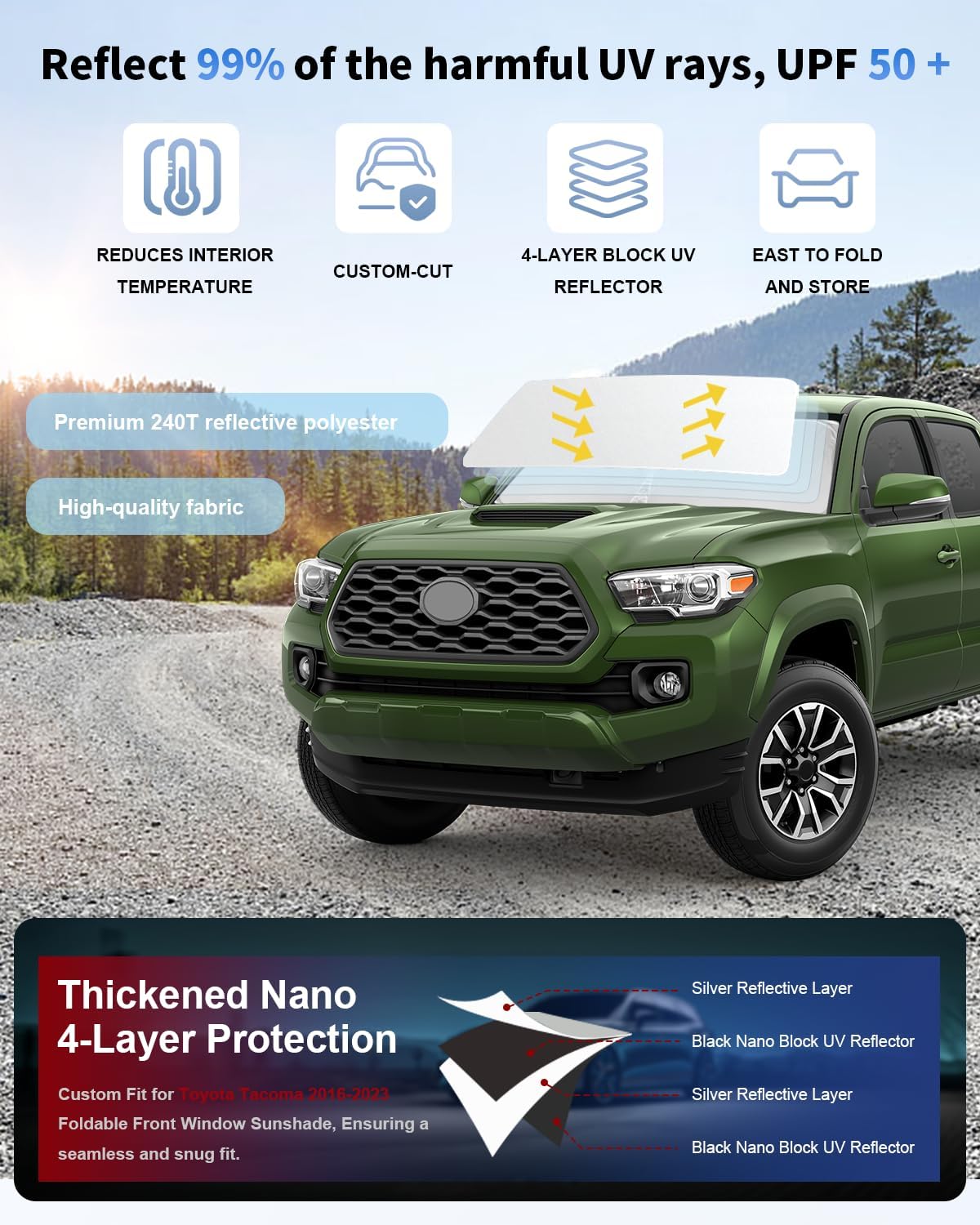 - âď¸ăVehicle SpecificăOur Windshield Shade Cover custom fit for Toyota Tacoma 2016-2026 ,Full covered your windshield,No Gap,100% Perfect fit. Its custom cut design and reinforced steel rings ensure a secure fit well.