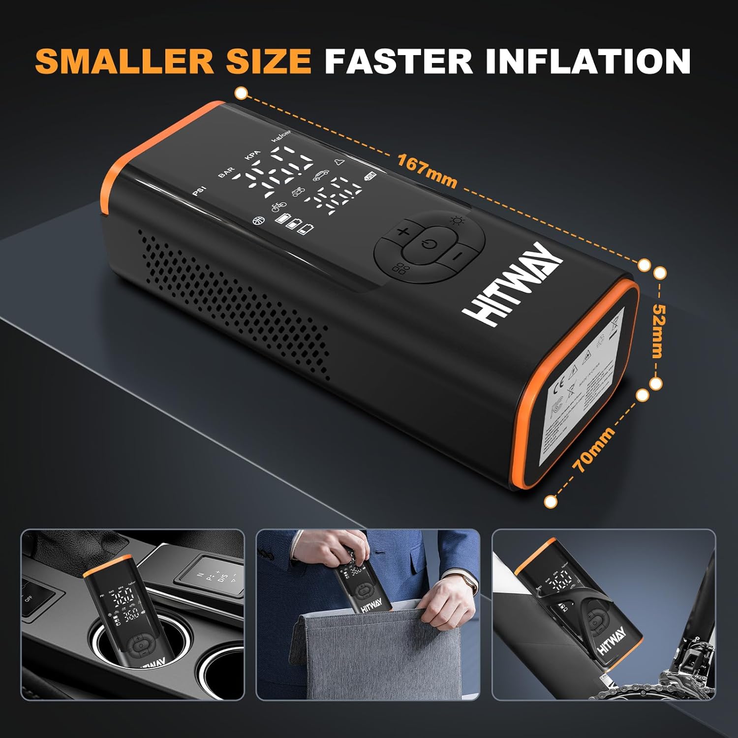 - 【HITWAY 12V portable air pump】:The powerful tire inflator is equipped with a high-performance chip that can quickly inflate the tires. It provides a maximum pressure of 150 PSI and an air flow rate of 20L/Min. Its compact size (19.25 x 5.45 x 12.3 cm) and accompanying handbag make it easy to carry and carry around.