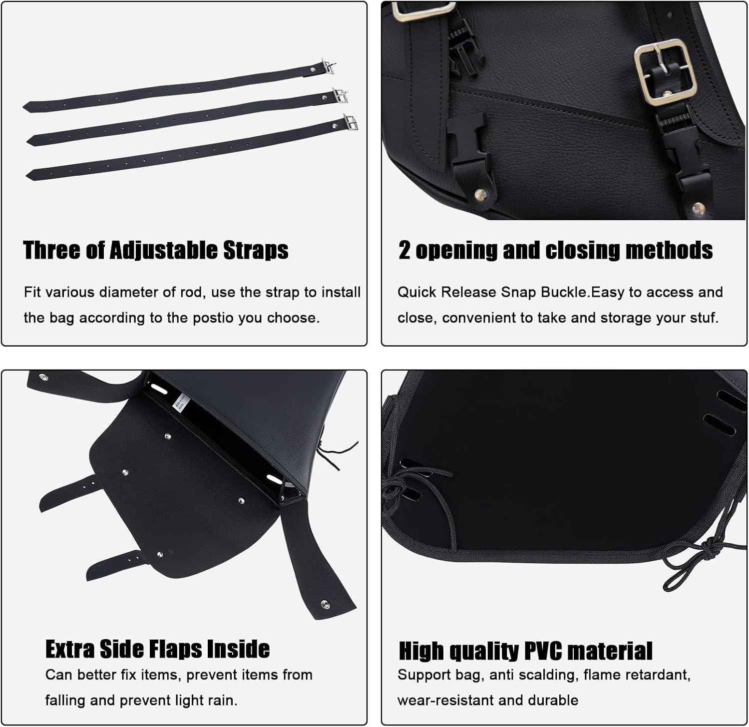 - 【Premium Material】This motorcycle saddlebags is made up of soft and durable heavy-duty PVC. The reinforced sewing and moderate thickness make our motorcycle saddle bag can always keep its shape and longer service life.