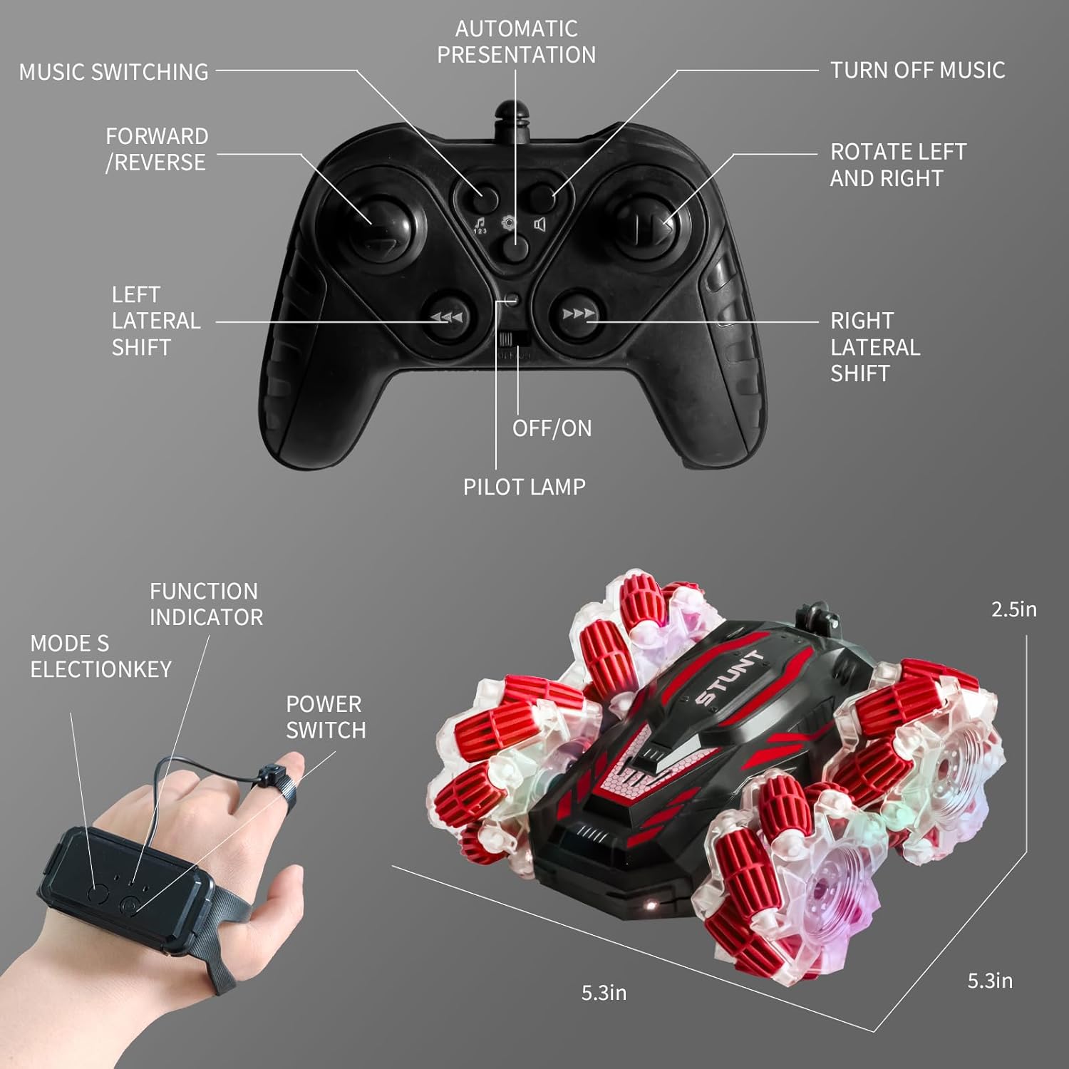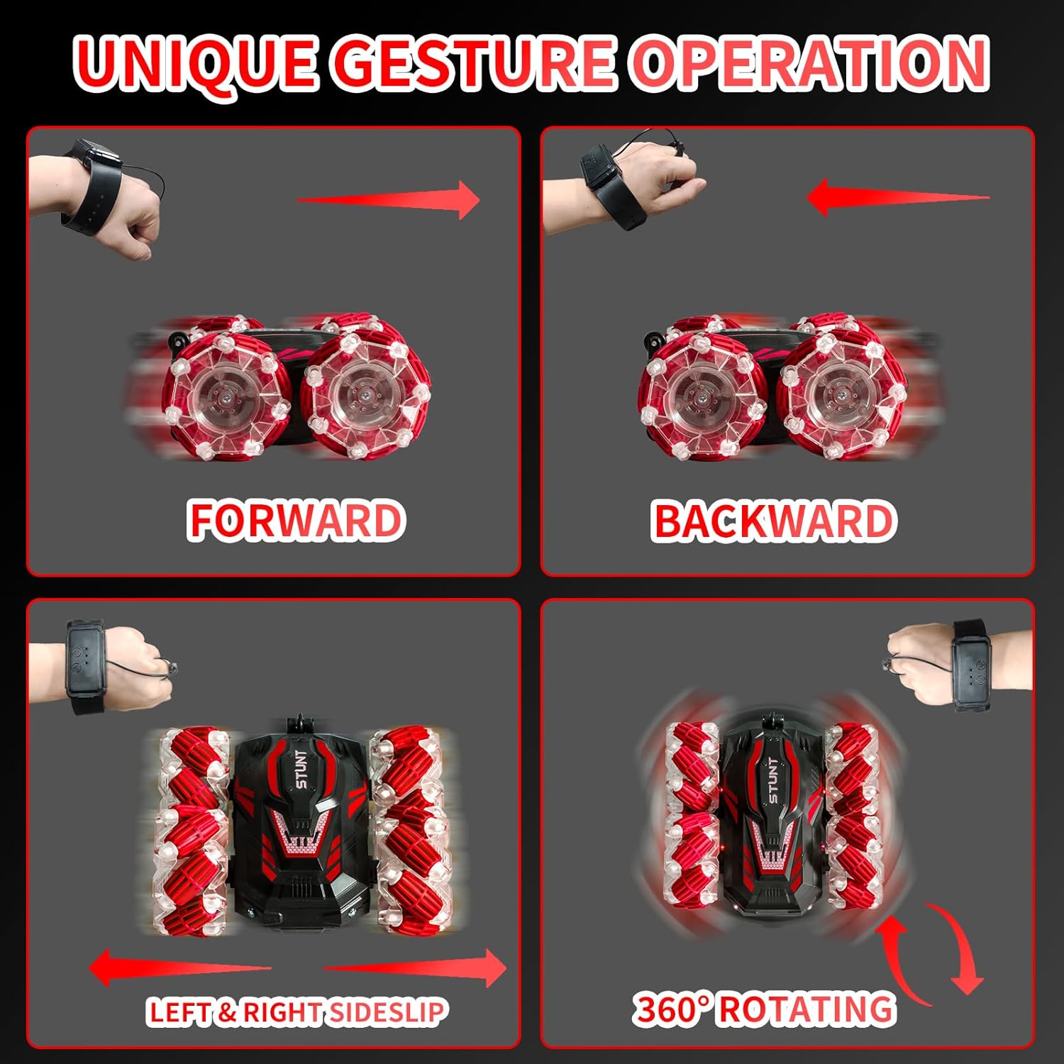 - Colorful Lighting And Cool Music: The 4WD gesture sensing rc stunt car is equipped with dazzling and stunning lighting and sound. Use these gestures to control the car by hand or through the watch, which will bring more fun to kids