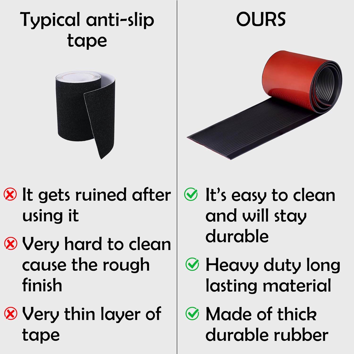 - DURABLE HEAVY-DUTY RUBBER MATERIAL – Our outdoor step treads grip tape is made of heavy-duty thick rubber material and is exceptionally durable. It prevents curling, tearing, wrinkling, or lifting even under the rigors of heavy foot traffic.