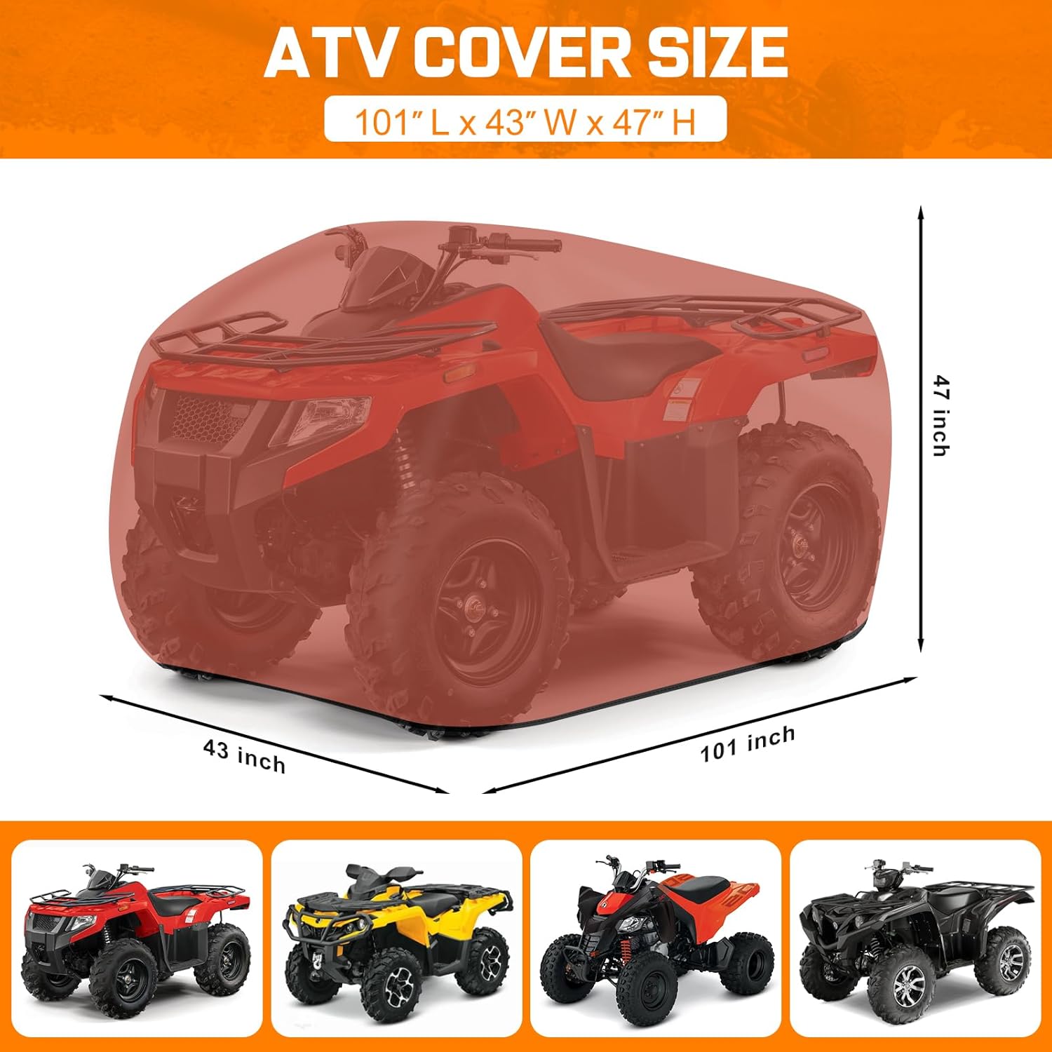 - | Universal Fit 101 Inch ATV Cover | - Measures 101" x 43" x 47" (L x W x H), Comnova ATV covers are designed to fit most brands' 4 wheeler ATV, including: Polaris, Kawasaki, Arctic Cat, Honda, Yamaha and More. For special outdoor ATV models, please check the size carefully.