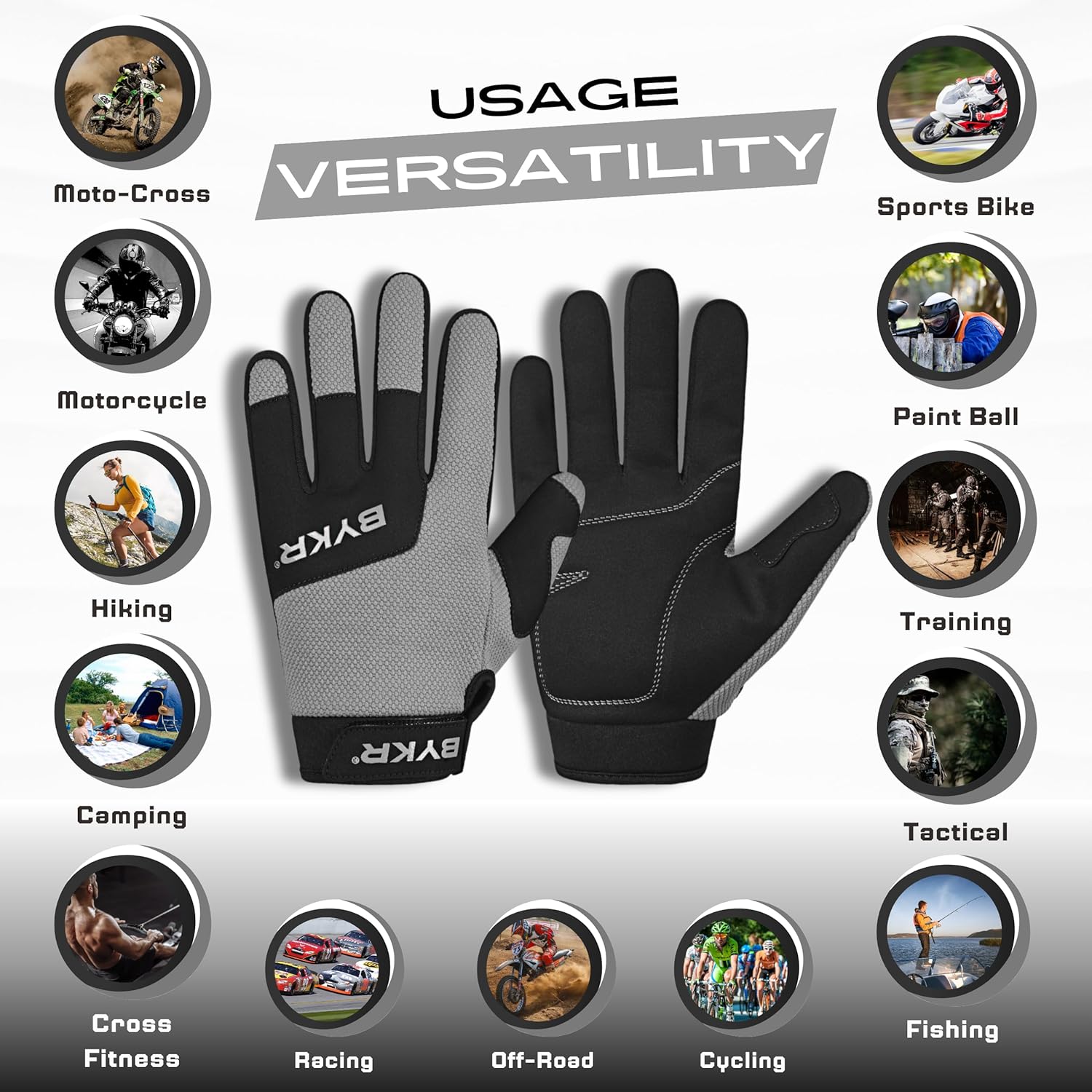 - SUPREME VERSATILITY: BYKR motocross gloves are all purpose and can be used for all types of outdoor adventure sports such as dirt bike gloves, mechanic gloves, dual sport gloves, atv gloves, motorcycle riding gloves, motocross gloves, cycling gloves, MTB gloves, ski gloves & also as car driving gloves.