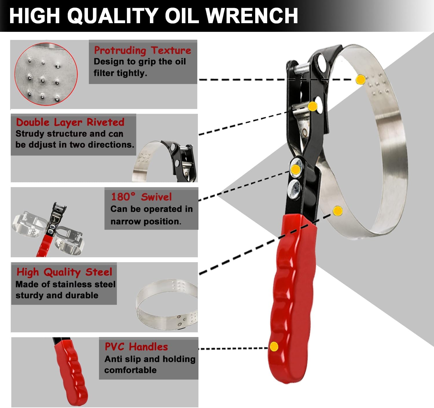 - Unique Design: The oil filter wrench tool is designed with sturdy double layer riveted structure that can be adjust in two directions and swivel 180 degrees for easy use in narrow spaces. The protruding texture on the band provides a secure grip on the oil filter, preventing slippage during use.