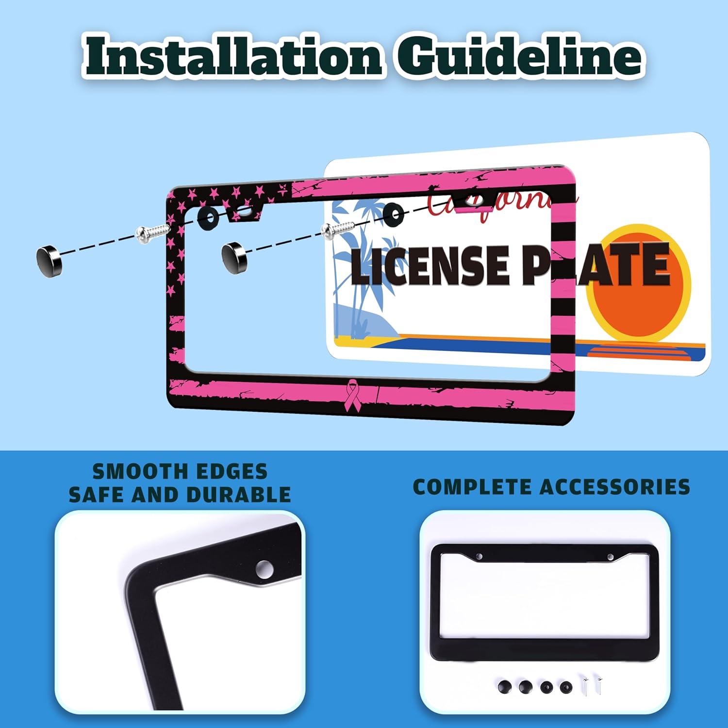 Breast Cancer Awareness Pink Ribbon License Plate Frame American Flag License Plate Holder for Front or Rear Car Tags Reusable Stainless Steel Funny Car Decoration with Screws 6.3 X 12.2 in