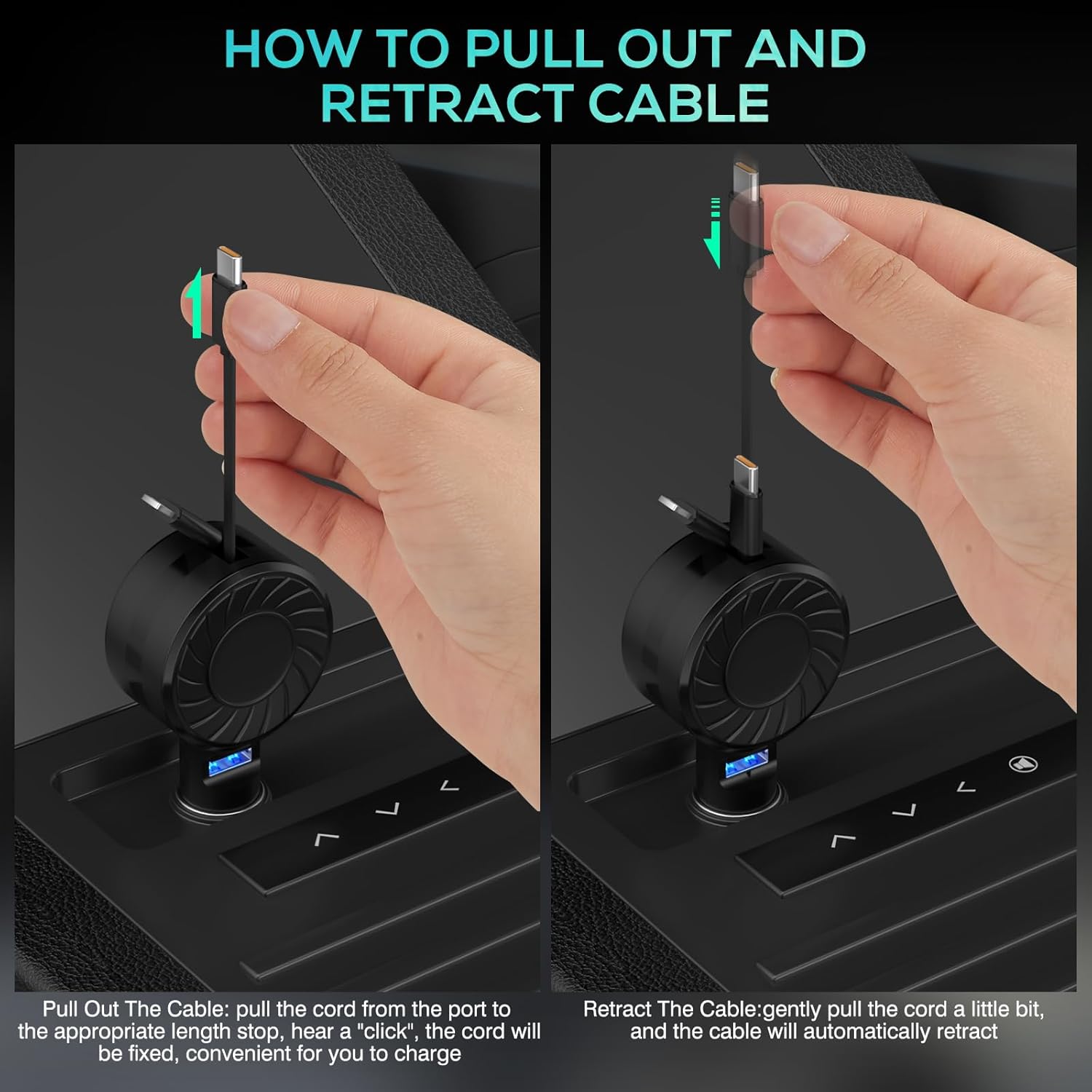 - Retractable Charging Cord : 2 pieces retractable cords(one is lighting cable and another is USB-C cable) support more convenience for charging in the car. The long cable allows you charge the device in any seats meanwhile use the phone free. The cable retracts smoothly and automatically, it offers effortless storage. When in use, simply pull out the cable until you hear a “click” for secure fixing, making charging a breeze. When not in use, a gentle tug retracts the cable automatically, keeping space neat and tidy.