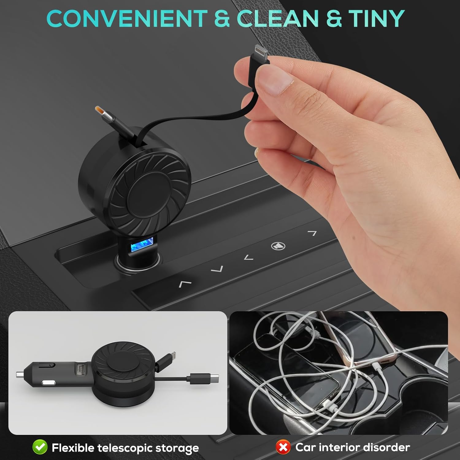 - Retractable Charging Cord : 2 pieces retractable cords(one is lighting cable and another is USB-C cable) support more convenience for charging in the car. The long cable allows you charge the device in any seats meanwhile use the phone free. The cable retracts smoothly and automatically, it offers effortless storage. When in use, simply pull out the cable until you hear a “click” for secure fixing, making charging a breeze. When not in use, a gentle tug retracts the cable automatically, keeping space neat and tidy.